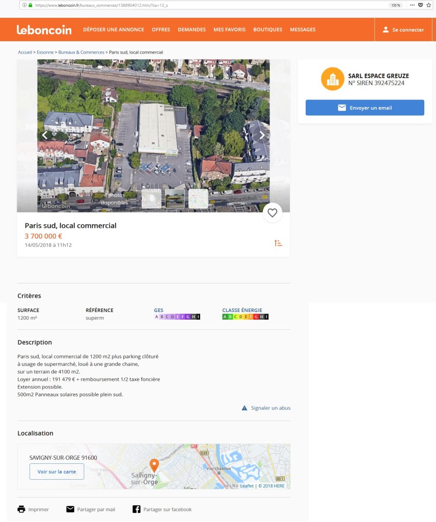 Donc je m’inscris en faux de ce qu’en a dit le maire. Le local commercial est bien en vente (ou en location) sur Le bon coin depuis le 07 mai 2018 par la SARL Espace Greuze. L’annonce a été réactualisée le 14 mai 2018, et on peut la retrouver à ce lien.