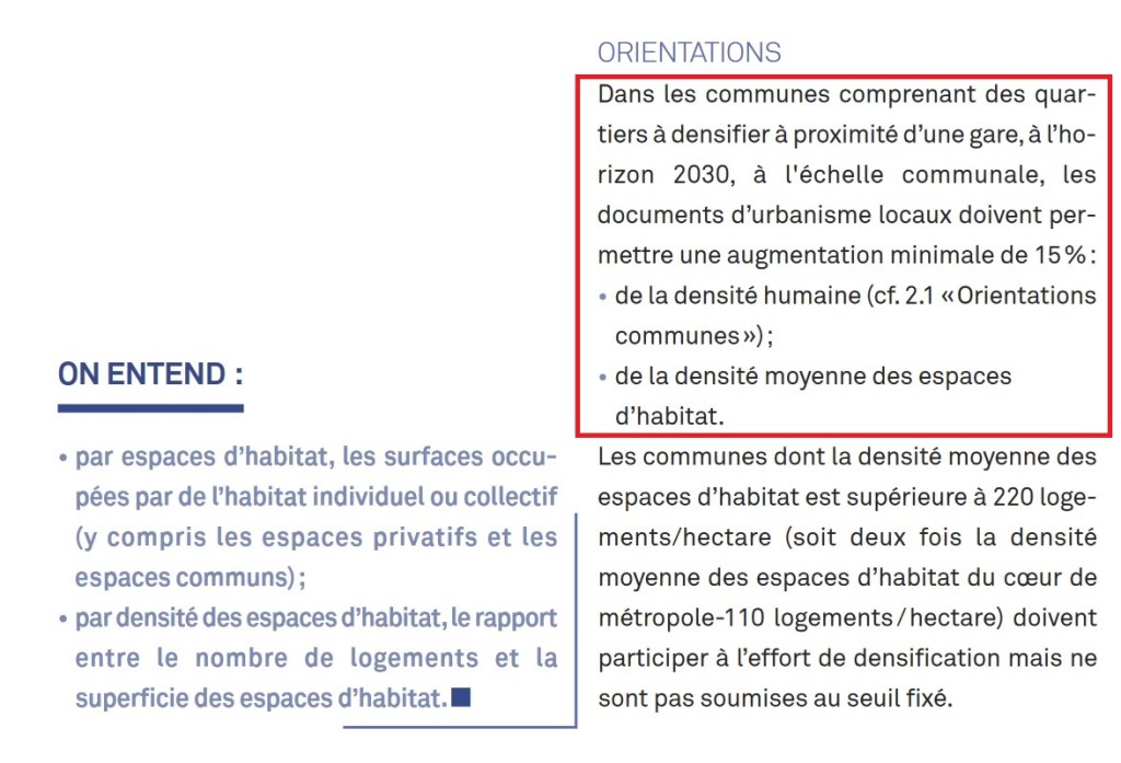 Donc on doit augmenter d’ici 2030 la densité moyenne des espaces d’habitat de 15 %, soit la faire passer de 81,5 logements par hectare à 94 (93,725) logements par hectare (x 1,15).