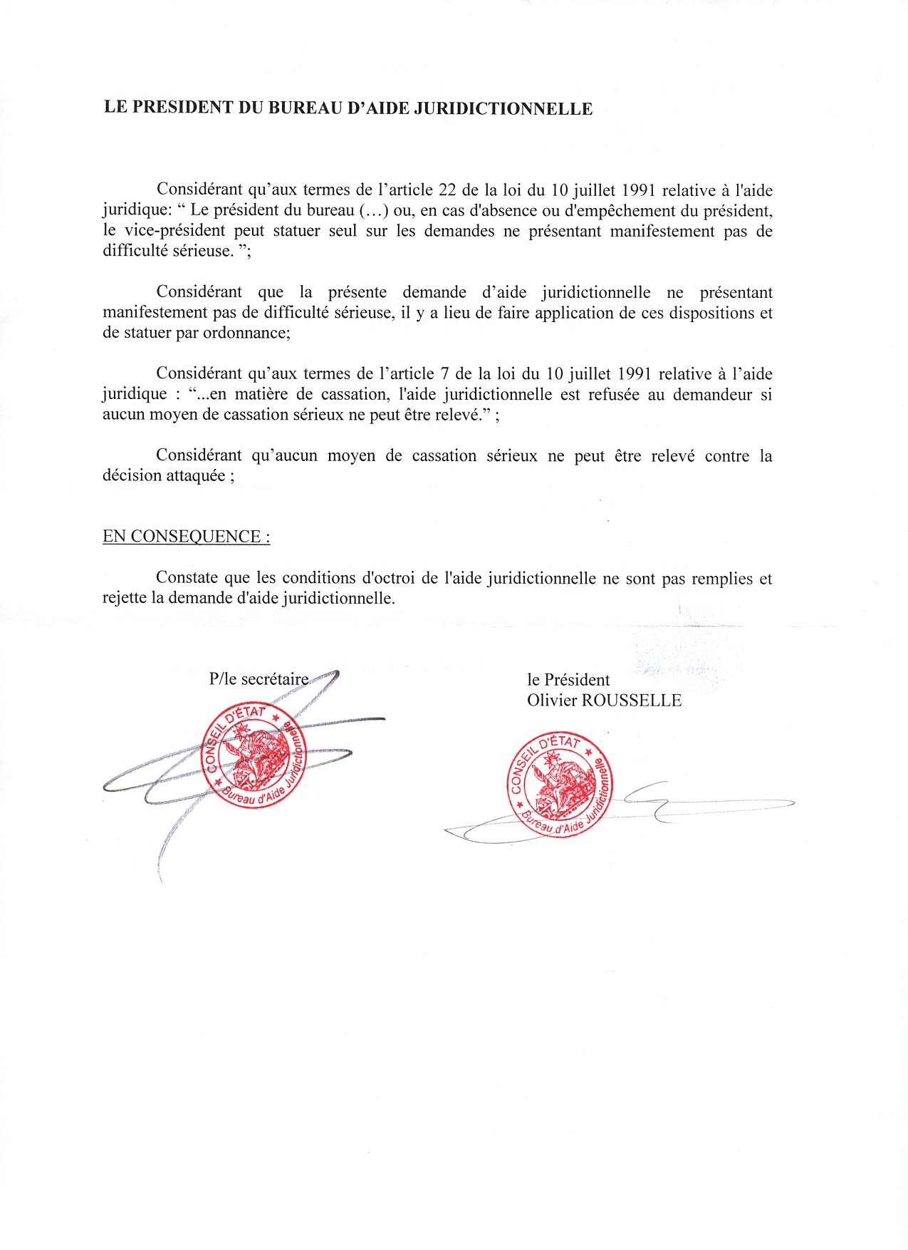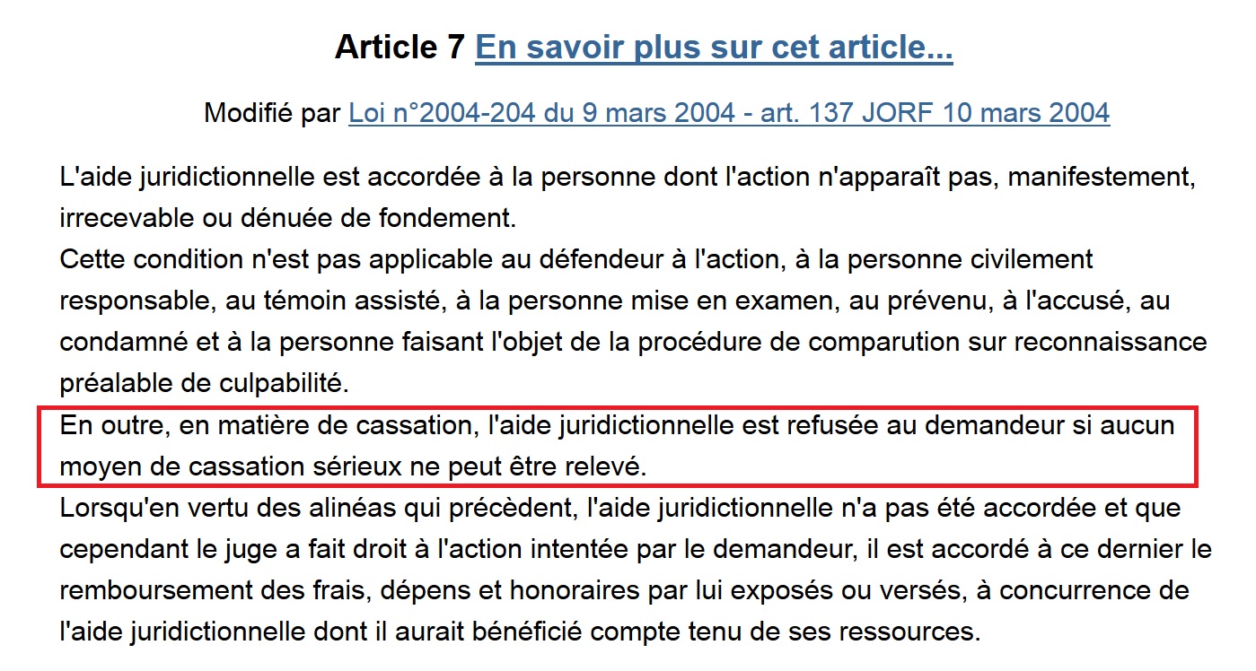 Le saviez-vous ? L’article 7 de la loi du 10 juillet 1991 relative à l’aide juridique (aide juridictionnelle) dispose que l’aide juridictionnelle est refusée au demandeur en matière de cassation, lorsque « aucun moyen de cassation sérieux ne peut être relevé ». Alors je suis peut-être un peu con, mais je pensais justement que c’était au Conseil d’État (où à la Cour de cassation) de statuer sur les moyens de cassation et pas au bureau d’aide…