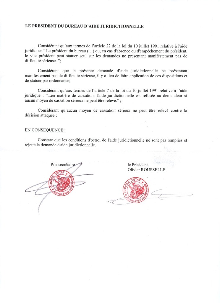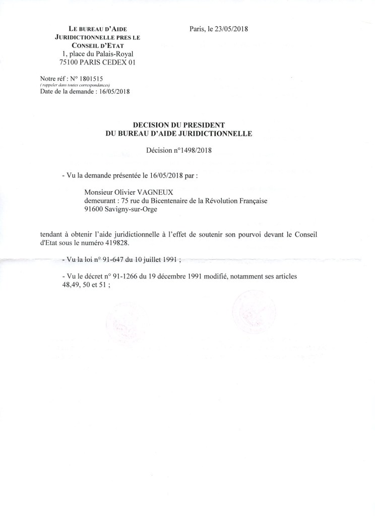 Je précise donc que je ne ferai pas appel de cette décision du bureau d’aide juridictionnelle, et que j’abandonne mon action pour faire valoir que les libertés politiques et individuelles n’ont pas été respectées dans le cadre de la préfiguration de la rénovation urbaine du quartier de Grand-Vaux à Savigny-sur-Orge ! Mais que je n’arrête pas pour autant, avec d’autres formes d’actions qui sont en cours parce que la Loi n’est quand même pas respectée !