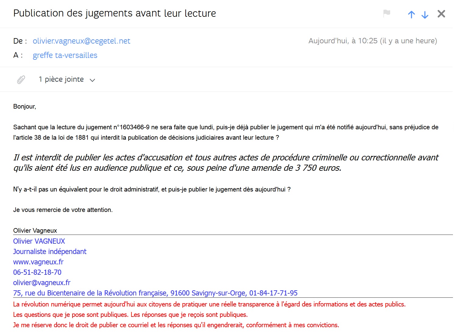 Je m’en suis donc ouvert au greffe du Tribunal, notamment pour savoir si je pouvais publier le jugement sans m’exposer à des poursuites. Ce qui même si c’est contraire à l’esprit de la Loi, ne me semble pas interdit en tant que la loi du 28 avril 1881 ne concerne que les actes de procédures criminelles et correctionnelles. Donc je pense que je pourrais le faire, mais je ne souhaite pas le faire parce que la logique du droit veut qu’on attende la lecture publique.