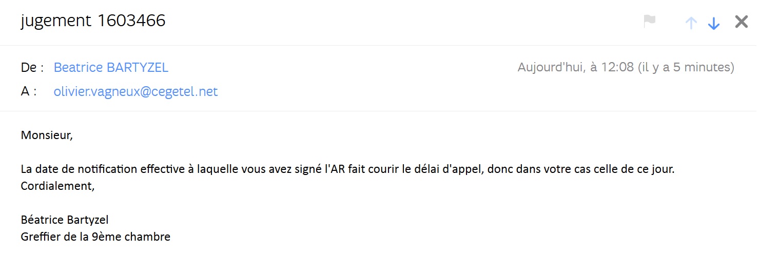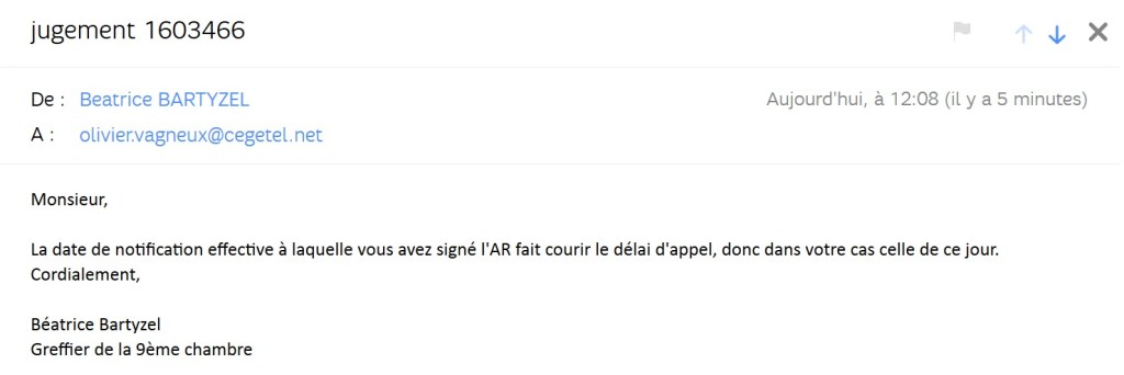 Et c’est là que je reçois un courriel du greffe en réponse à ma demande pour me dire que je n’aurais pas dû recevoir le jugement si tôt, qu’il s’agit d’une erreur et qu’il vaudrait mieux que je n’en publie pas le texte. Seule question en suspens. Quelle est la date de départ qui fait courir le délai de recours ? Car je peux l’écrire, j’ai perdu l’affaire en première instance, et je vais donc faire appel ! Sauf que le jugement n’a logiquement donc pas pu m’être notifié avant sa lecture…