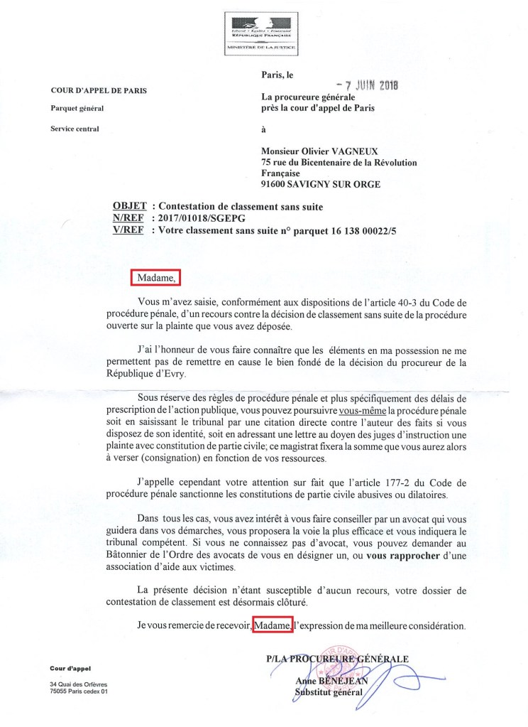 Je relancerai alors ma plainte, ce que je ne peux pas faire tant que l’affaire n’est pas jugée, en tant que je n’ai pas de nouveaux éléments à apporter, malgré que la Loi précise que les réunions d’un conseil citoyen sont publiques ! Or, si l’instruction de mon dossier est close depuis le 22 janvier 2018, il n’y aurait toujours pas de salle d’audience disponible pour fixer une date. À moins que ce ne soit juste une manœuvre dilatoire de la Justice pour perdre du temps…