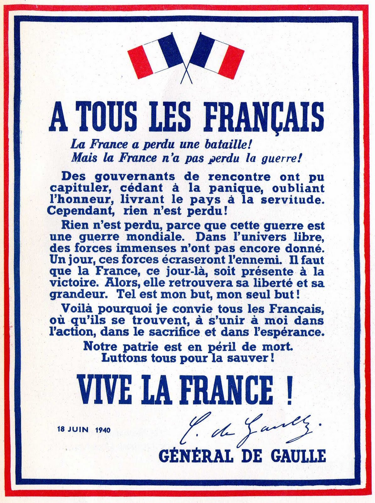 Inculture profonde du Gouvernement, et du secrétariat d’État aux anciens combattants. Ils confondent manifestement l’appel du 18 juin 1940, et l’affiche de Londres. Et tous nos gaullistes en carton pâte, qui dans nos villes se sont attribués l’apanage du gaullisme, mais qui ne sont même pas fichus de faire la différence entre les deux documents !