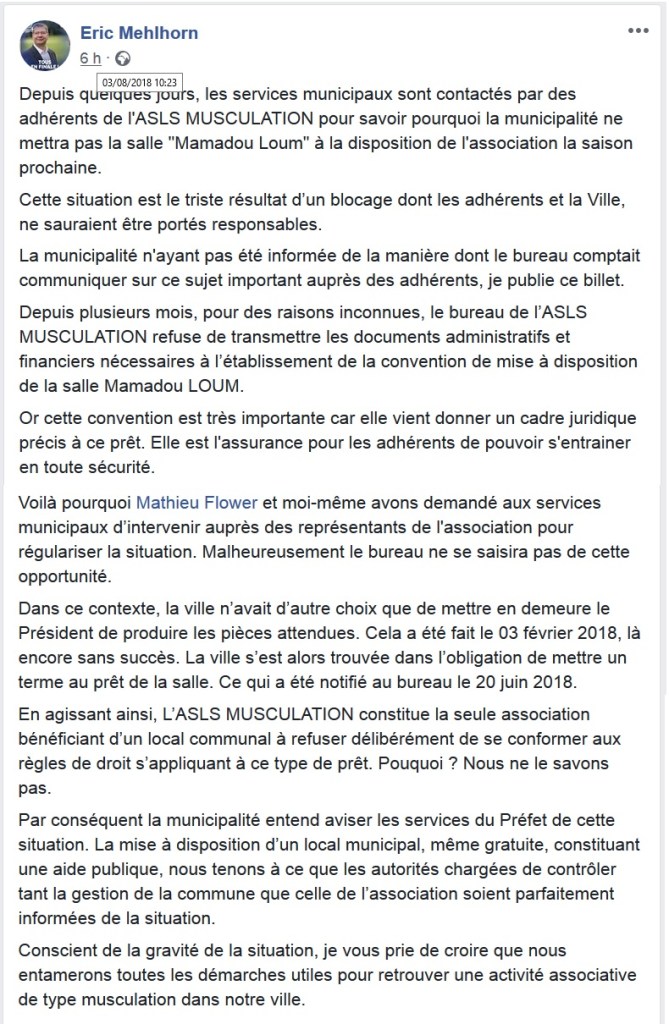 Enfin, ce qui est amusant au travers de la dernière phrase de MEHLHORN, dont je me demande encore si c’est vraiment lui qui a écrit ce texte (ça manque d’erreurs d’orthographe), est que la municipalité semble s’attendre à récupérer le matériel de musculation avec la salle, alors que celui-ci appartient en propre à l’ASLS…