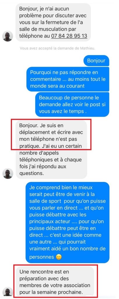 J’ai une bonne nouvelle pour tous les adhérents de l’ASLS Musculation ! L’adjoint aux Sports, Mathieu FLOWER, est rentré de déplacement ! Il va donc pouvoir, soit vous répondre personnellement par écrit (et donc laisser des traces), soit vous rencontrer tous ensemble. Et à ce sujet, M. FLOWER annonce en exclusivité une rencontre avec DES membres de l’association, bien que le bureau de l’ASLS n’en soit pas encore informé…