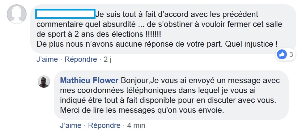 On relèvera à ce propos l’agressivité du maire-adjoint : « Merci de lire les messages qu’on vous envoie », ce qui peut laisser penser derrière ce « on » impersonnel, qu’il y a une offensive de plusieurs personnes pour éteindre l’incendie.