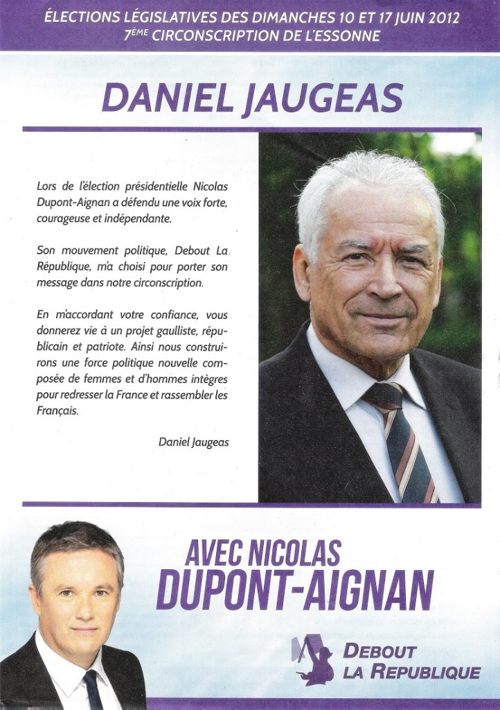 Nous sommes deux mois avant les élections régionales de décembre 2015. Ces quelques mots sont prononcés devant moi par Nicolas DUPONT-AIGNAN (NDA), président de Debout-la-France (DLF), en présence d’Hélène BRUNG, alors responsable DLF de la 7e circonscription et secrétaire générale adjointe du mouvement. Quelques années après, aucun « ménage » n’a été fait, mais il reste intéressant de voir quels termes emploie NDA concernant Daniel JAUGEAS, du moins devant moi.