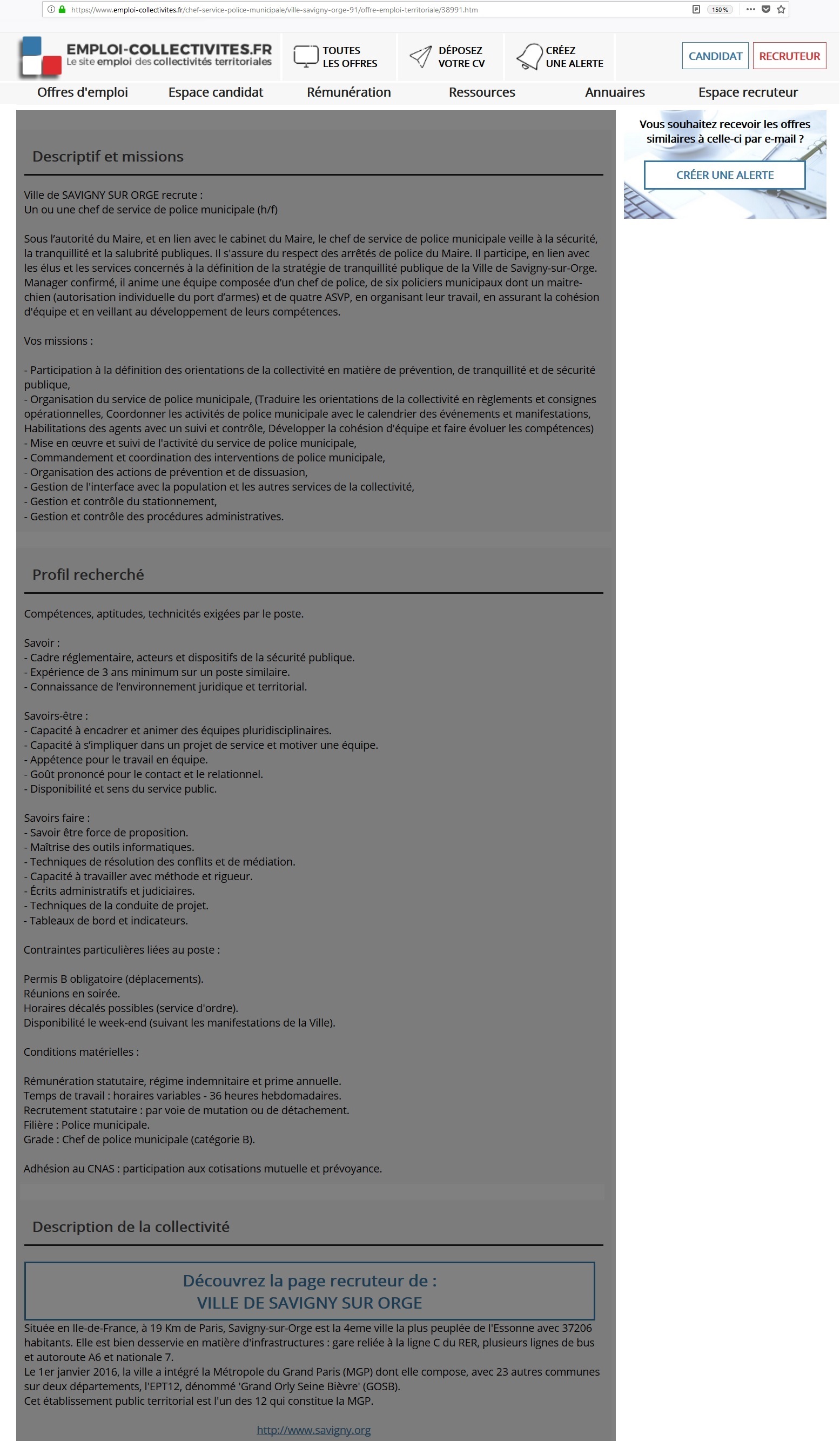 Je sais donc que l’offre d’emploi, que je republie en bas de page, a été diffusée le 12 juillet 2018 sur le site Emploi-Collectivités.fr. Que la Ville a retenu 4 candidatures, même s’il y en a déjà une qui ne semble pas convenir. Et j’ai deux versions quant à la date du remplacement ; l’une début novembre pour que le nouveau chef prenne son poste au 11 novembre ; et l’autre à la toute fin du mois de novembre. Par contre, je ne sais pas quand ils pensent le dire à BRUNETTO…
