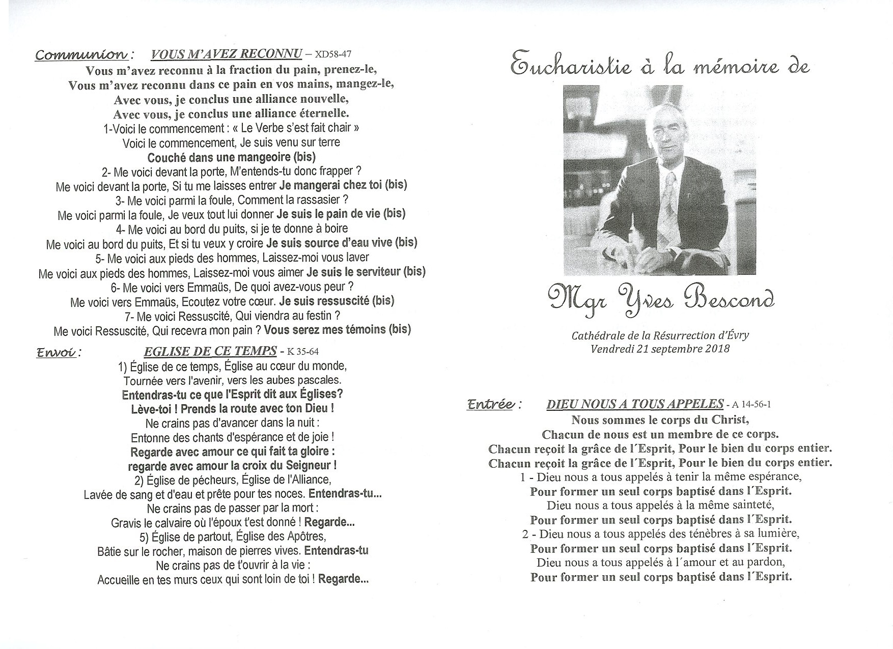 J’étais ce vendredi 21 septembre 2018 à l’eucharistie, présidée par l’actuel évêque, en mémoire de l’évêque administrateur par intérim du diocèse d’Évry – Corbeil-Essonnes : Mgr Yves BESCOND, décédé un mois auparavant. Nous n’étions malheureusement pas très nombreux pour témoigner de notre reconnaissance à un pasteur qui a essayé de faire bouger l’Église catholique en Essonne, à une époque où l’Église romaine ne l’a pas suivi.