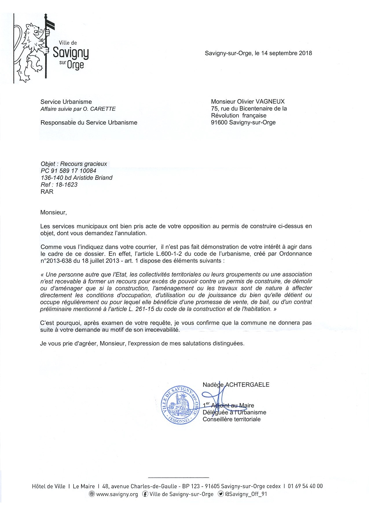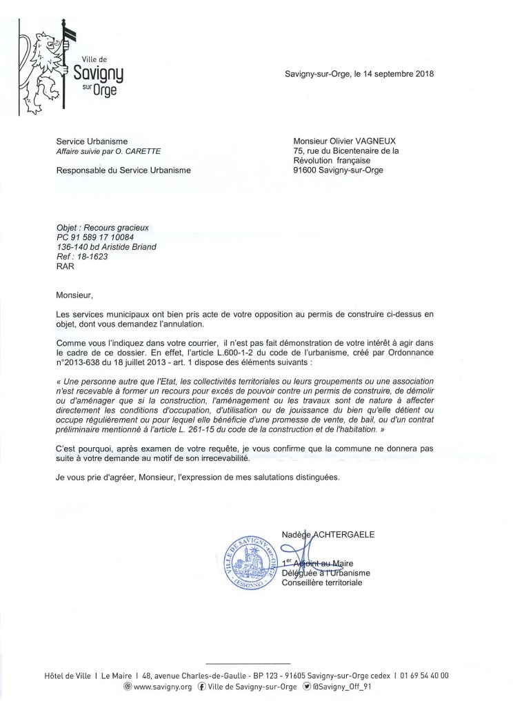 Sans surprise, mon recours gracieux contre la construction de 17 mètres de haut à l’angle des rues Joyeuse, Briand et Perdrix est rejeté par la mairie. Ce qui est juste dommage est que ni Olivier CARETTE, responsable de l’urbanisme, ni Nadège ACHTERGAËLE, adjointe, n’aient motivé leur recours par rapport à mon grief d’irrespect des dispositions du Plan local d’urbanisme (PLU). Ni vu ni connu, ils ont quand même méprisé leur propre zonage.