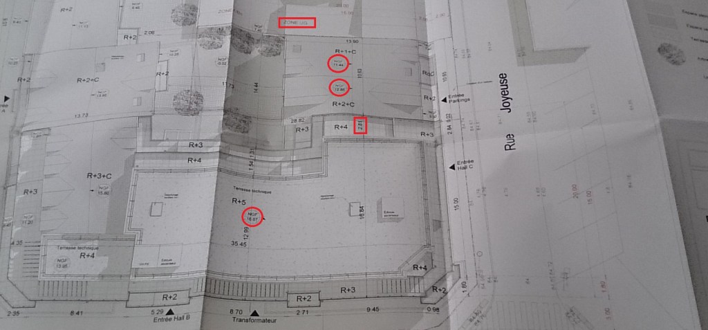Tel est le cas ici, ainsi que vous pouvez le voir sur le plan de l’architecte (zoomez pour lire les détails). L’immeuble en zone UB de 16,67 mètres de haut est à seulement 2,81 mètres de distance de l’immeuble de 12 mètres 88 de haut qui sera en zone UG. Ce premier ne peut donc pas rester si haut sur une zone de 10 mètres de distance avec la construction en UG.