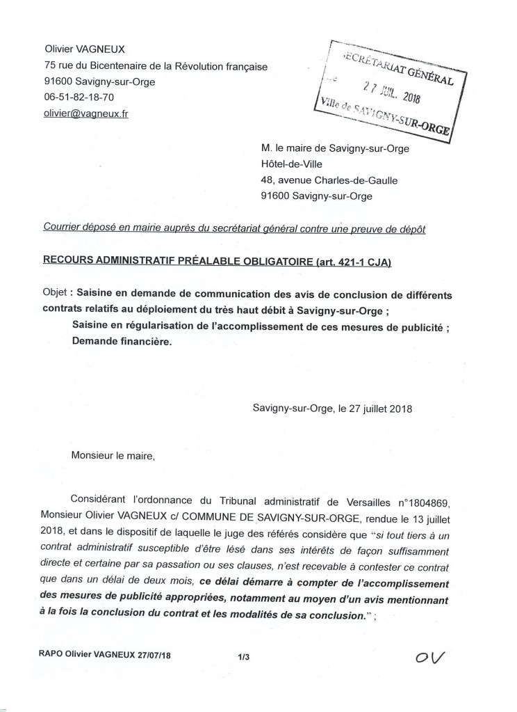 Par courrier, enregistré au secrétariat général de la Commune en date du 27 juillet 2018, je vous demandais, aux termes d’un recours administratif préalable obligatoire, (1) la communication des avis de conclusion de trois contrats relatifs au déploiement du très haut débit à Savigny, (2) la régularisation, au cas où celles-ci n’auraient pas été accomplies, de ces mesures de publicité, obligatoires selon la juridiction administrative (cf le deuxième point du dispositif de l’ordonnance TA Versailles n°1804869 du 13 juillet 2018, M. Olivier VAGNEUX c/ COMMUNE DE SAVIGNY-SUR-ORGE), et (3) le versement d’une somme de trois cents euros (300 €) au cas où vous ne seriez pas dans votre droit, et que vous n’auriez pas répondu à ma demande à l’issue d’un délai de deux mois, qui est le délai légal en la matière, en application des articles L.231-4-1° et L.231-4-3° du code des relations entre le public et l’administration (CRPA), me contraignant ainsi à diverses autres procédures parmi lesquelles la présente.