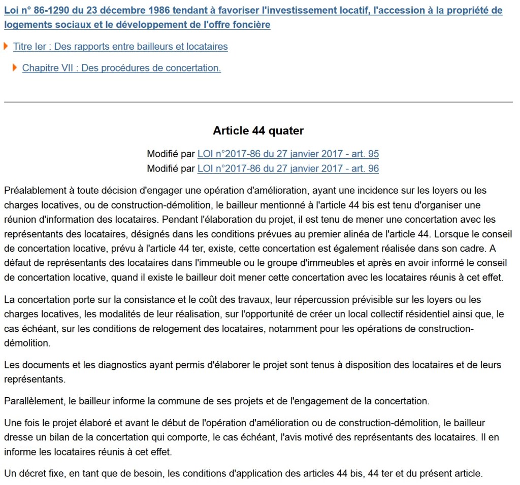 Cette règle découle directement de l’article 44 quater de la loi n°86-1290 du 23 décembre 1986, lequel prescrit une concertation obligatoire sur les conditions de relogement des locataires dans les opérations de construction – démolition.