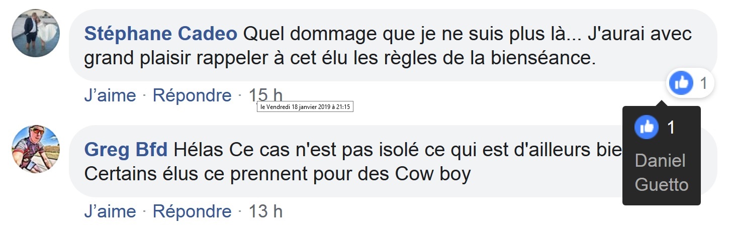 « Quel dommage que je ne suis (sic!) plus là… J’aurai (sic) avec grand plaisir rappeler (sic) à cet élu les règles de la bienséance. » (Stéphane CADÉO, le 18 janvier 2019)