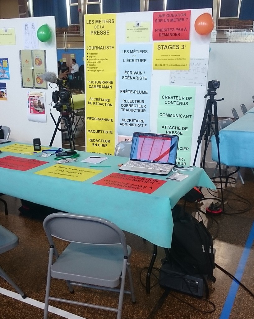 Ce samedi 16 février, j’ai donc tenu un stand au forum des métiers et de l’orientation qui s’est tenu au COSOM, afin de présenter les différents métiers de la presse et de l’écriture, notamment le journalisme.