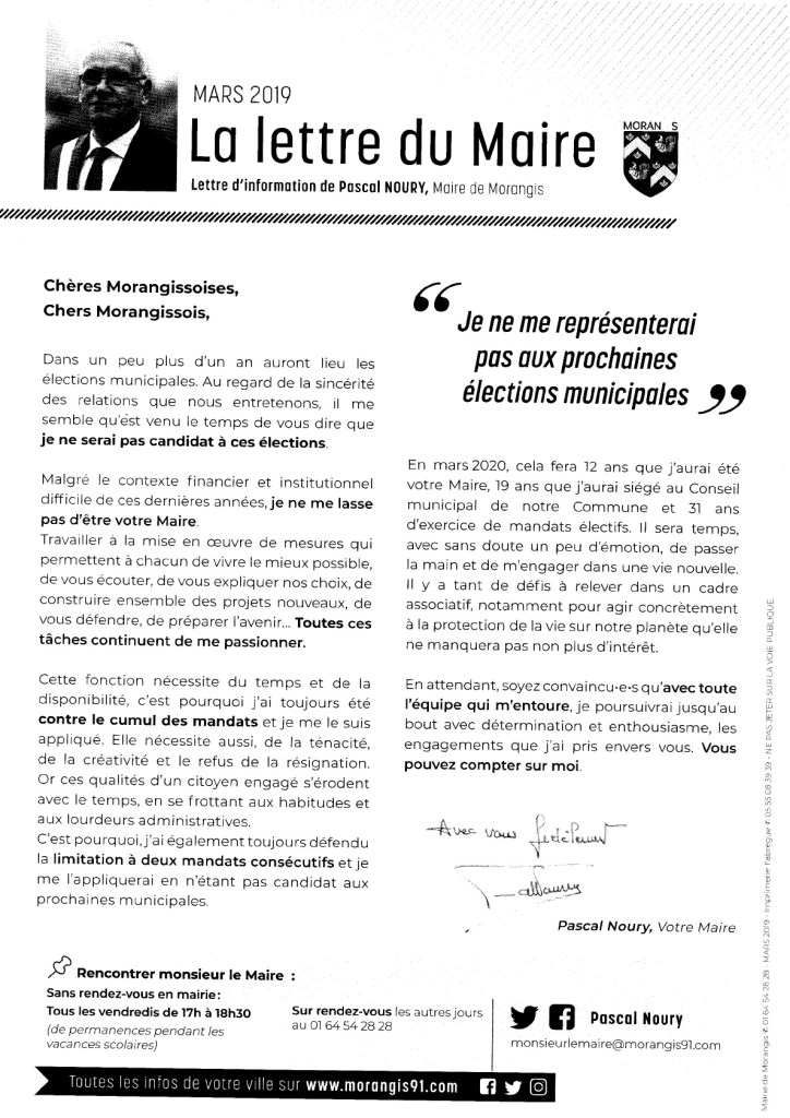 Sur la lettre de Pascal NOURY, maire de Morangis, de mars 2019, dans laquelle il annonce qu’il ne se représentera pas