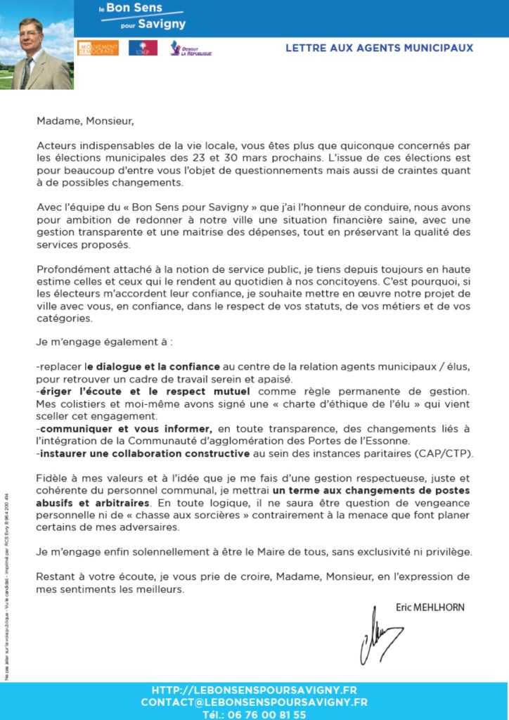 Enfin, pour la blague, même si elle est de très mauvais goût, je voudrais quand même rappeler ce que certains faisaient promettre à MEHLHORN dans sa lettre de campagne aux agents municipaux (en bas d’article).