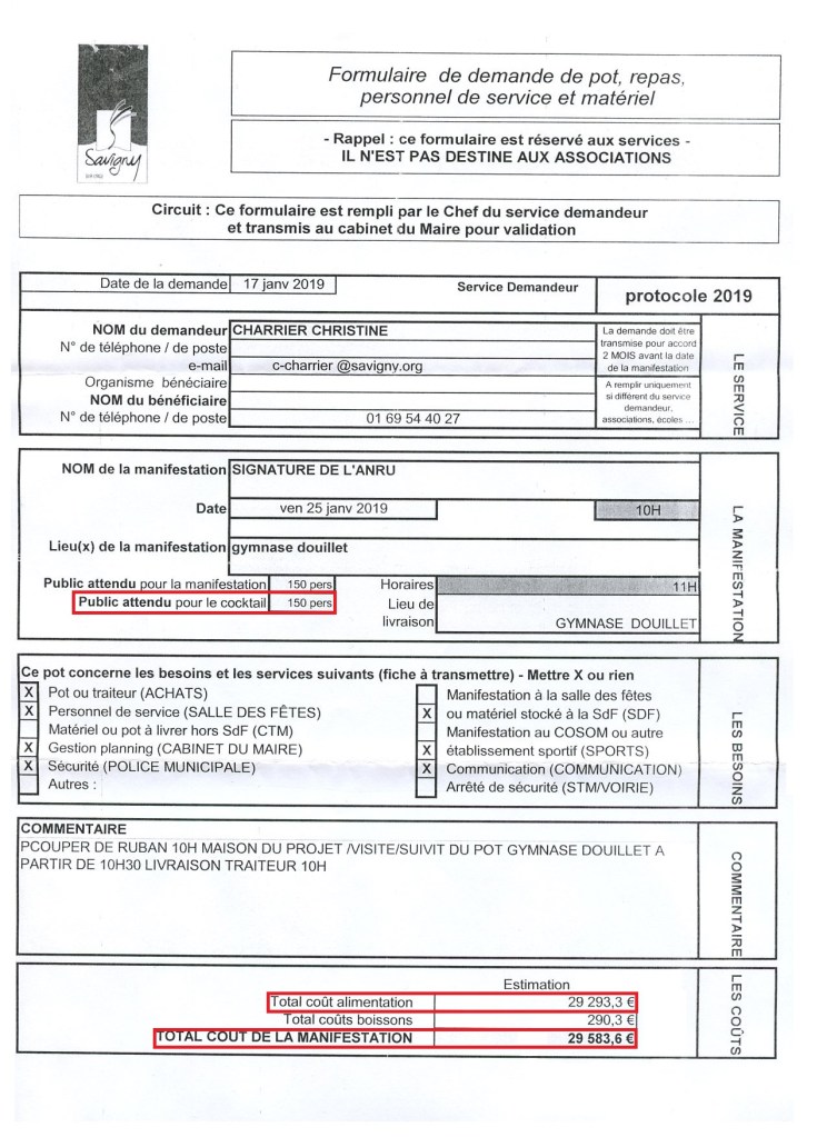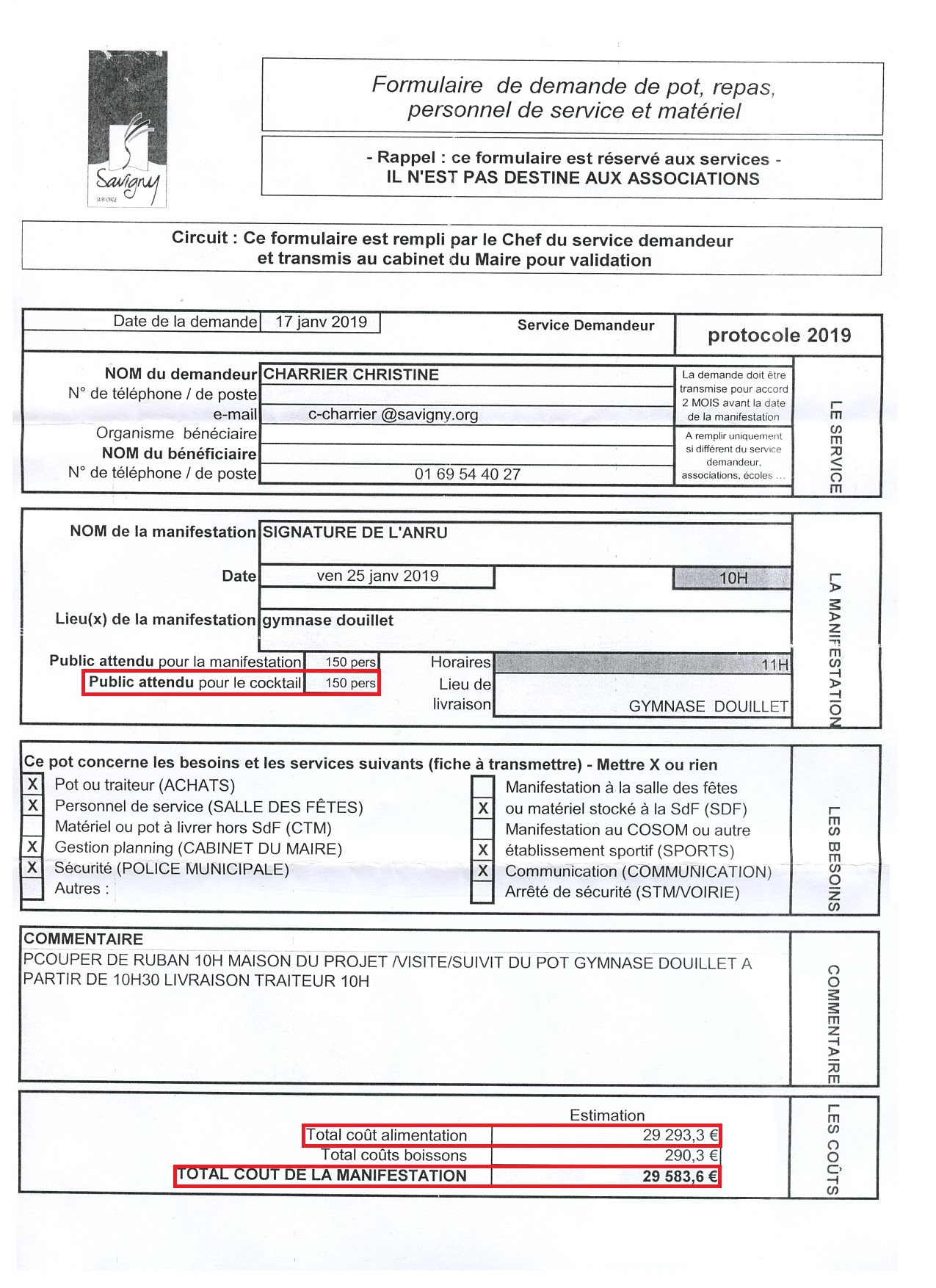 En effet, la Commune a dépensé 29 583,60 € de frais de bouche pour le cocktail déjeunatoire qui a suivi la signature d’engagement de l’ANRU le vendredi 25 janvier 2019.