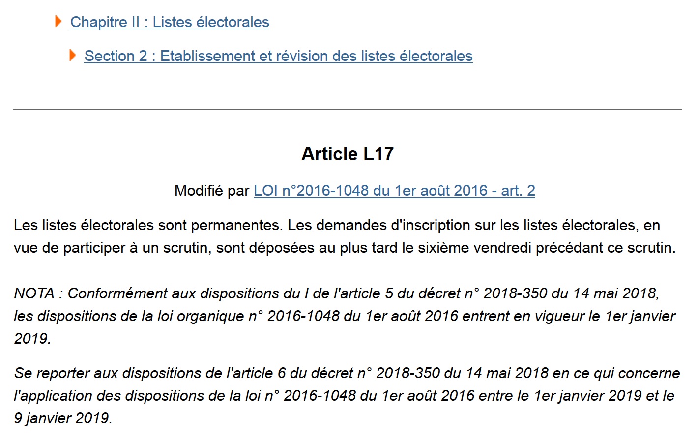 En effet, la loi n° 2016-1048 du 1er août 2016 rénovant les modalités d’inscription sur les listes électorales et instituant le répertoire électoral unique dispose en son article 2, qui a modifié l’article L.17 du code électoral, que l’inscription sur les listes électorales est possible jusqu’au sixième vendredi avant le scrutin.