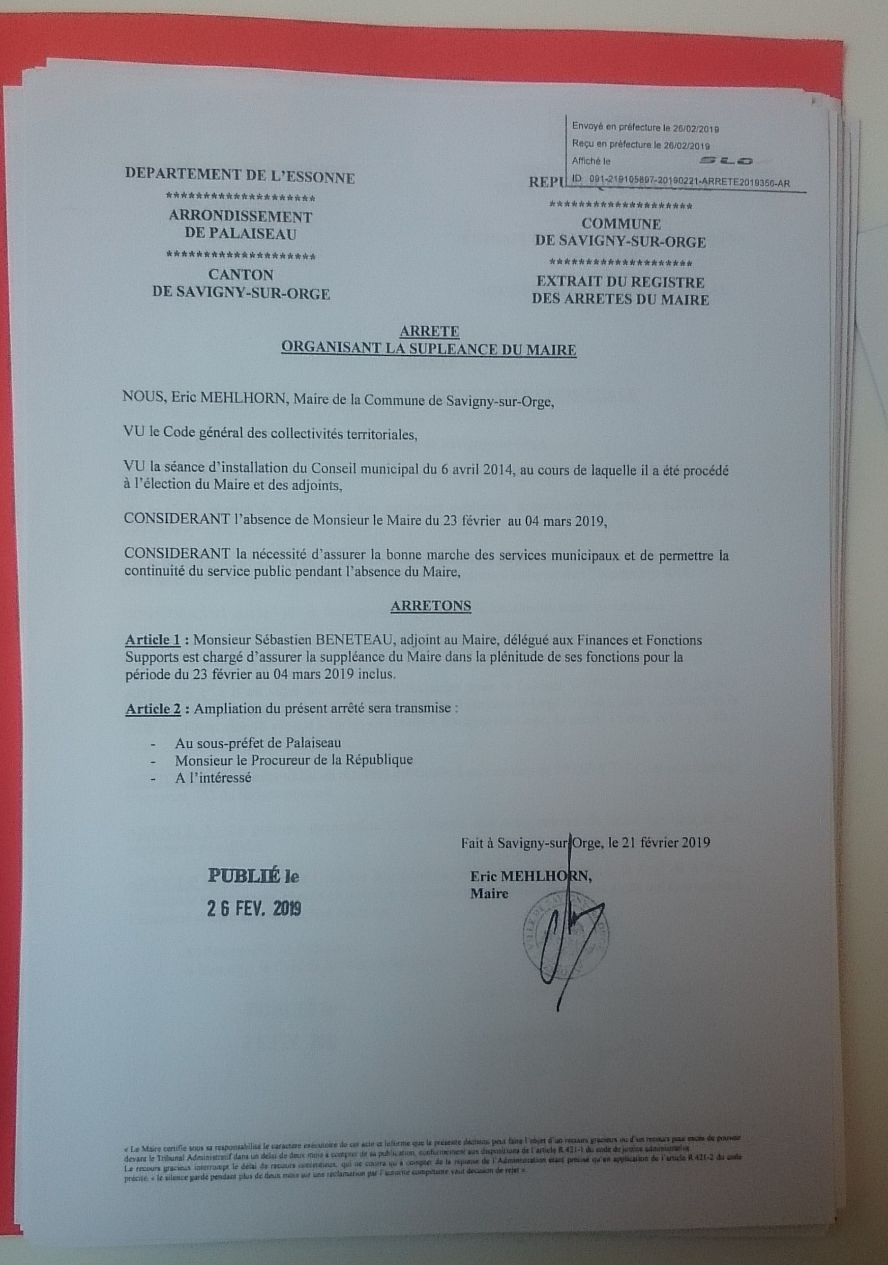 Ainsi, je découvre par exemple cet arrêté qui organise la suppléance du maire, parce que mon cher MEHLHORN avait besoin de deux semaines de vacances pour se reposer d’avoir travaillé pendant sept semaines consécutives. C’est pire que les gamins à l’école. (Je suis méchant parce qu’en janvier, il y a eu le marathon des vœux – il avait des cocktails tous les soirs – et la visite du ministre.)