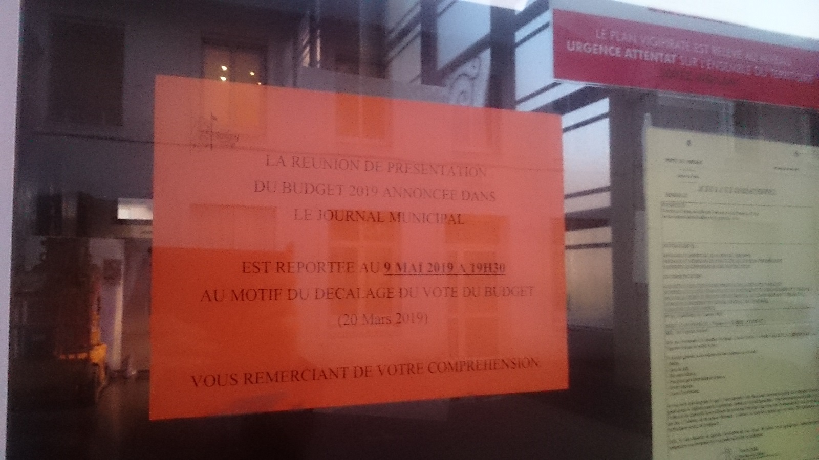 À 19 h 27, je vois arriver deux personnes dont le responsable de circonscription de Debout la France, Arnaud THION, donc parti allié de la majorité municipale, qui ne sont vraisemblablement pas informés du report.