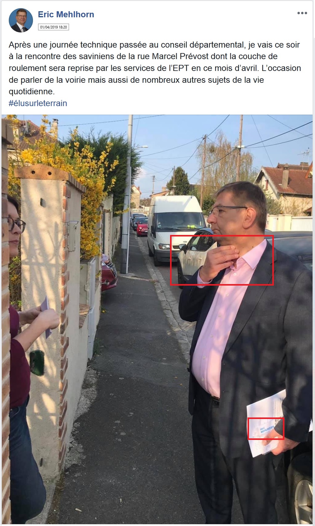 Enfin, pas si seul, parce qu’il y a une mystérieuse personne (de son cabinet ?) qui prend une photo des plus ratées, avec une riveraine à moitié masquée pour des questions de droit d’image, et un maire qui est en fâcheuse posture, pris à la gorge, qui ne sourit pas, avec en main, des papiers pour faire sérieux et un avis de passage qui met en gros le prénom et le nom de l’édile pour qu’on s’en souvienne dans l’isoloir.