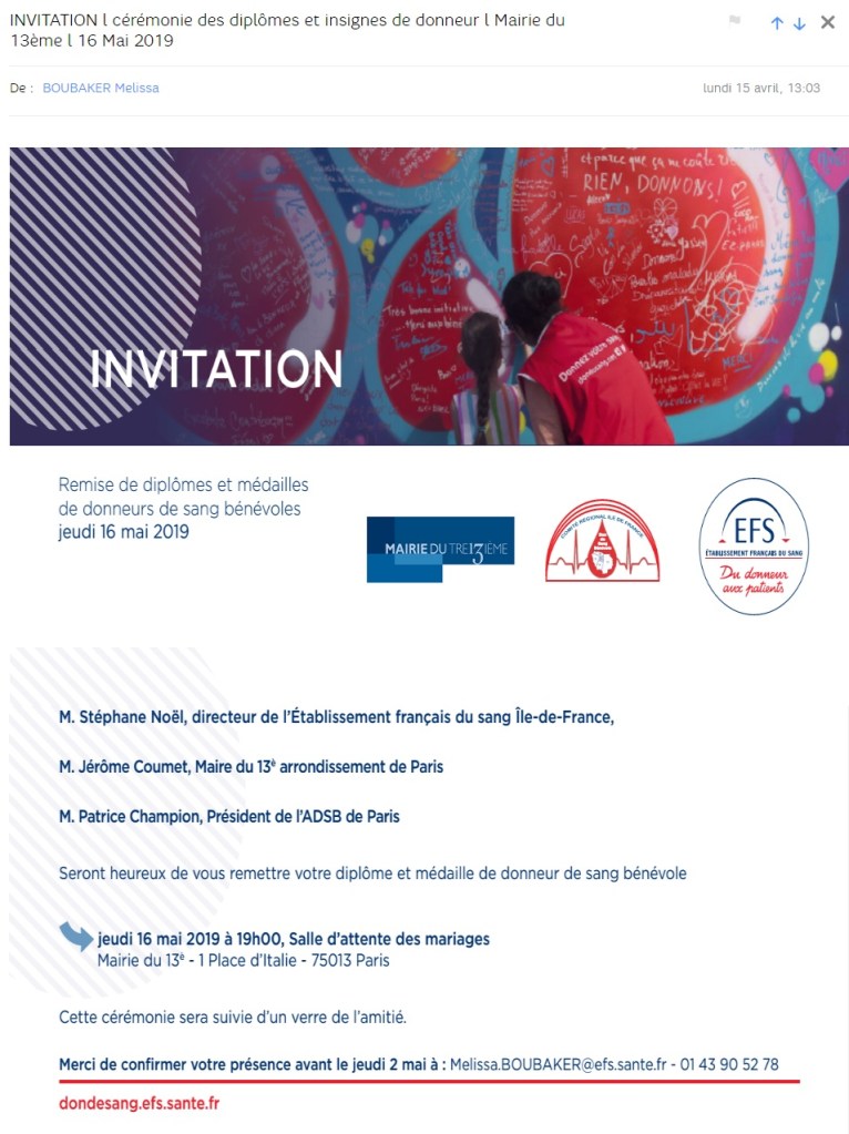 Je vous remercie pour votre invitation à la cérémonie de remise des diplômes et des insignes de donneurs de sang, prévue ce jeudi 16 mai 2019.