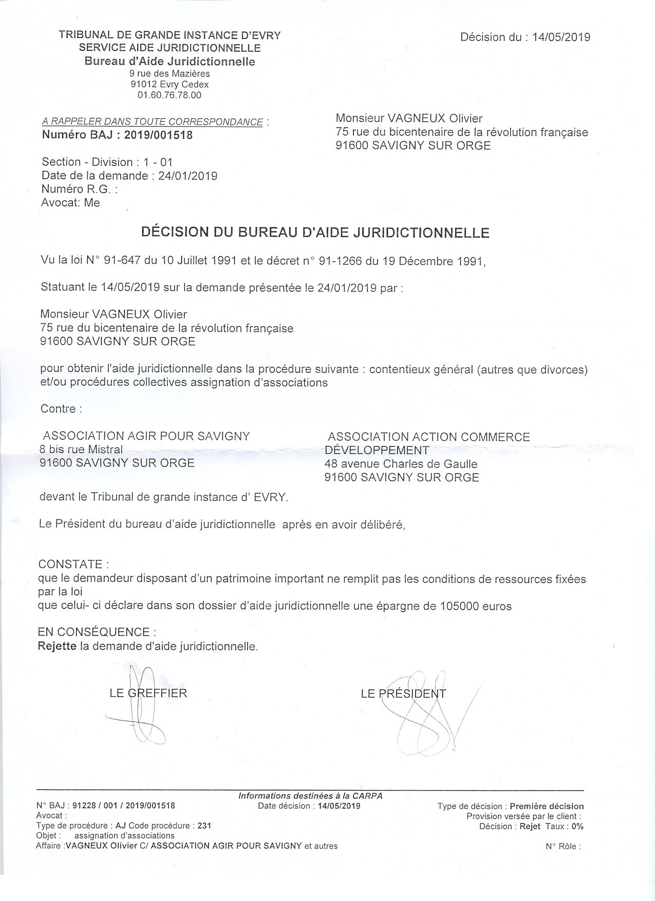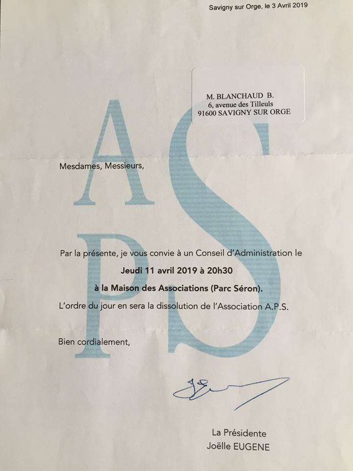Mais la bonne nouvelle, qui démontre le fruit de nos efforts, et qui nous est apprise par Bernard BLANCHAUD à qui j’emprunte ce courrier qu’il a publié sur son Facebook Nous Saviniens est que Agir pour Savigny a initié sa dissolution, parce qu’ils savent qu’ils ne sont pas tous blancs et que je vais finir par leur faire des ennuis… Donc ce ne sera jamais totalement une défaite, quelque soit l’issue de mes différentes démarches, et j’aurai réussi cela !
