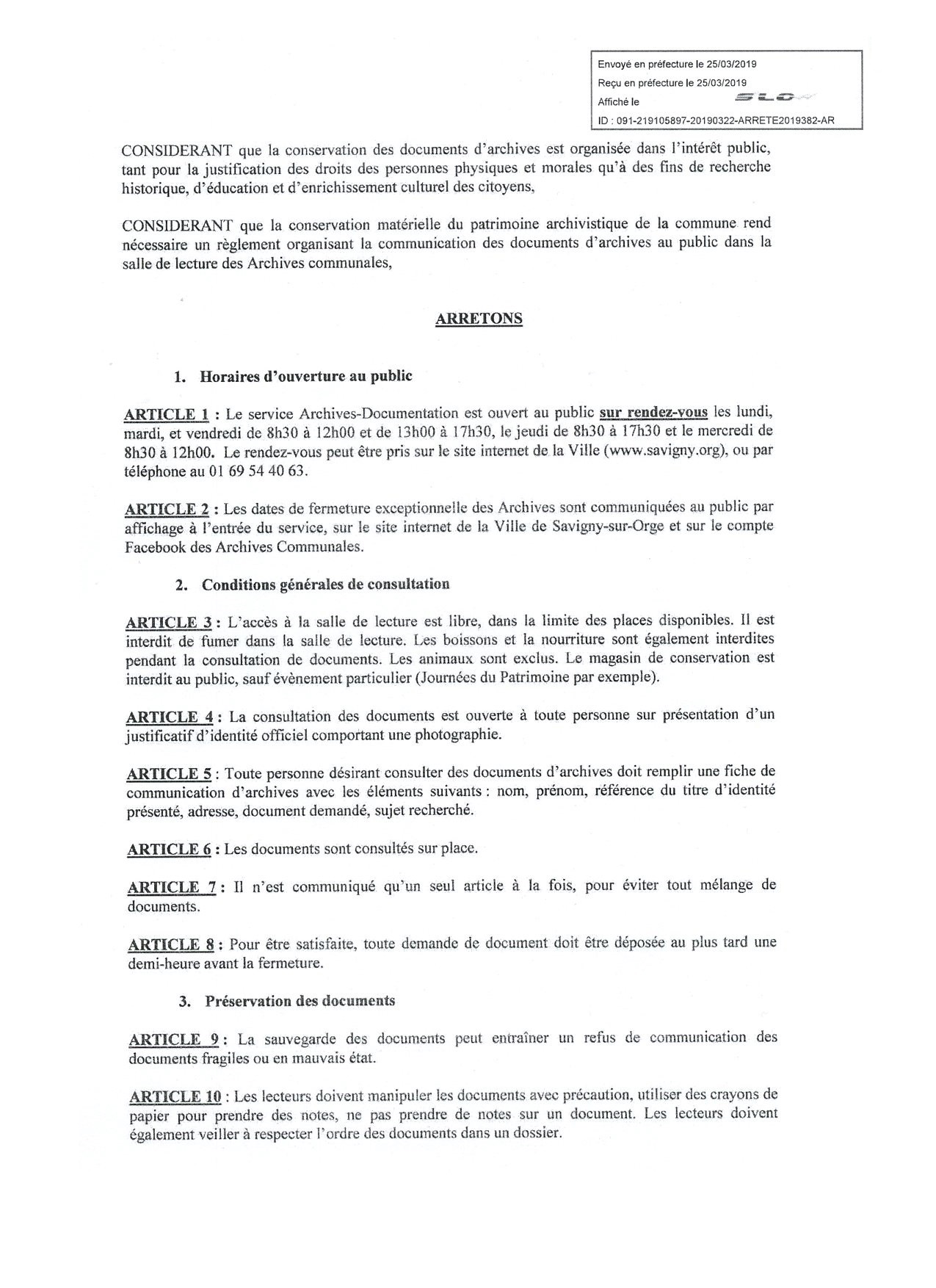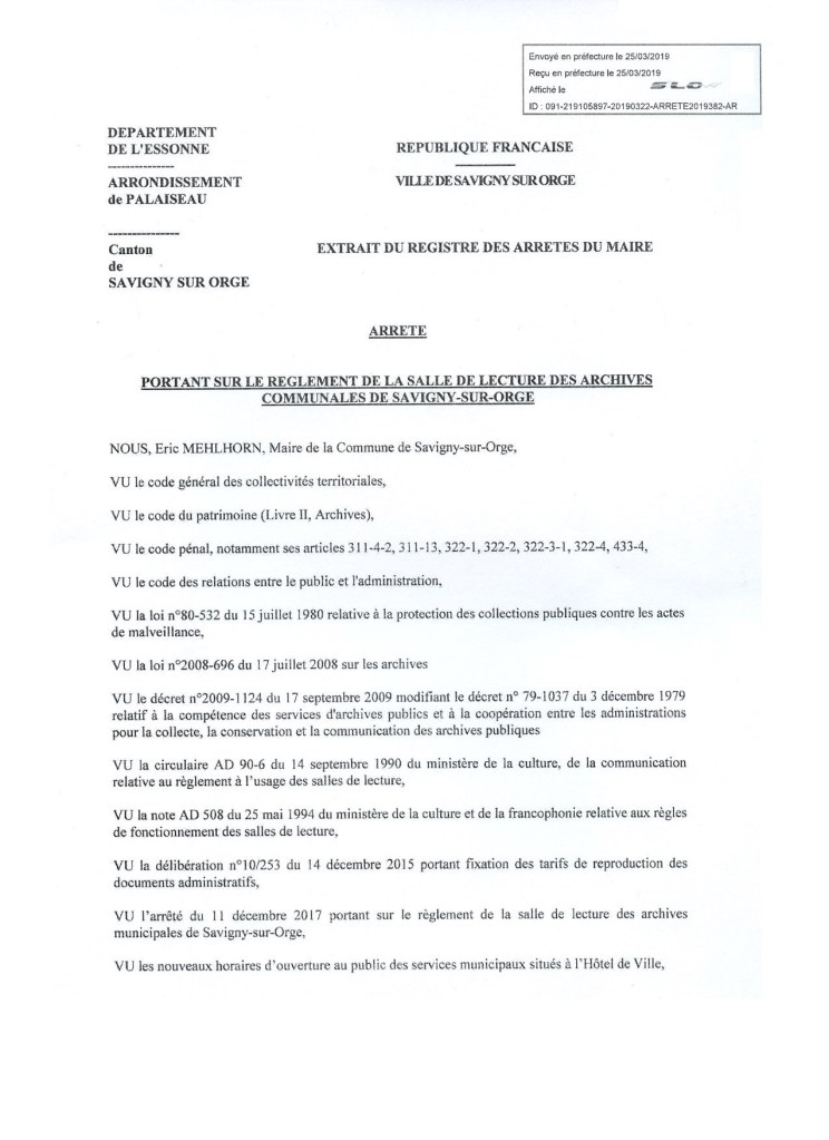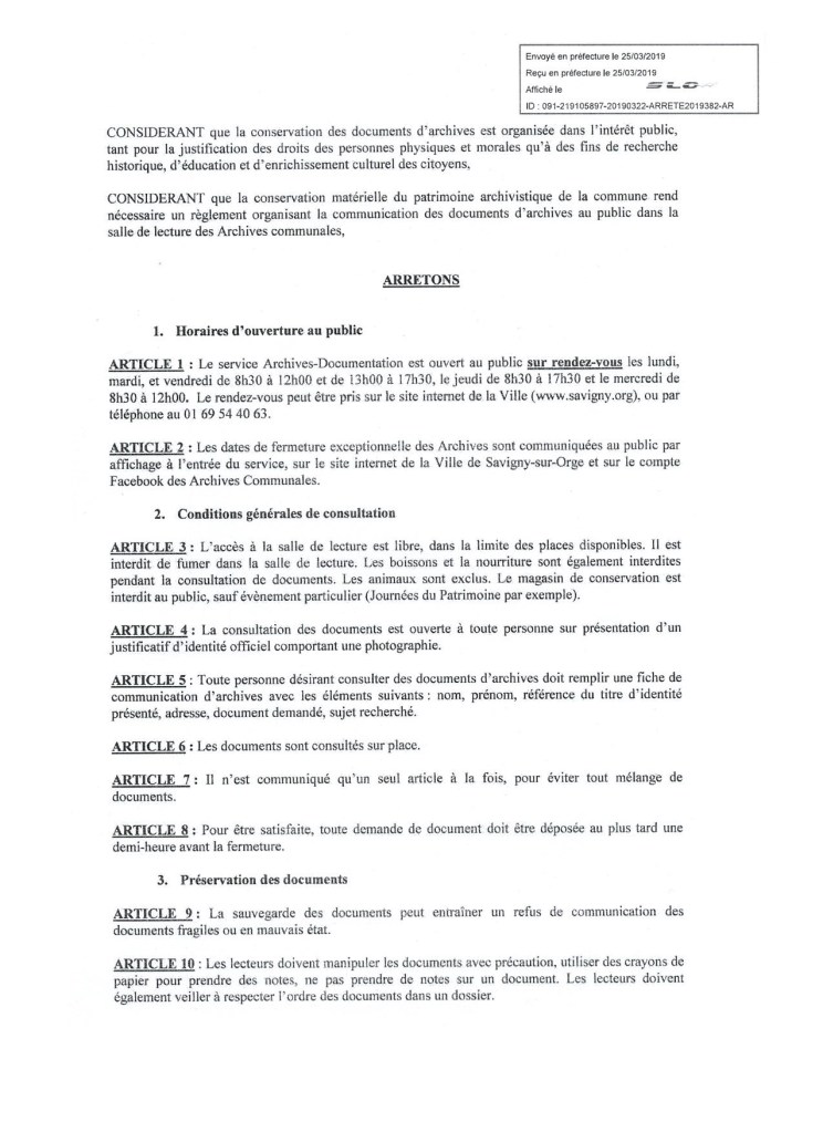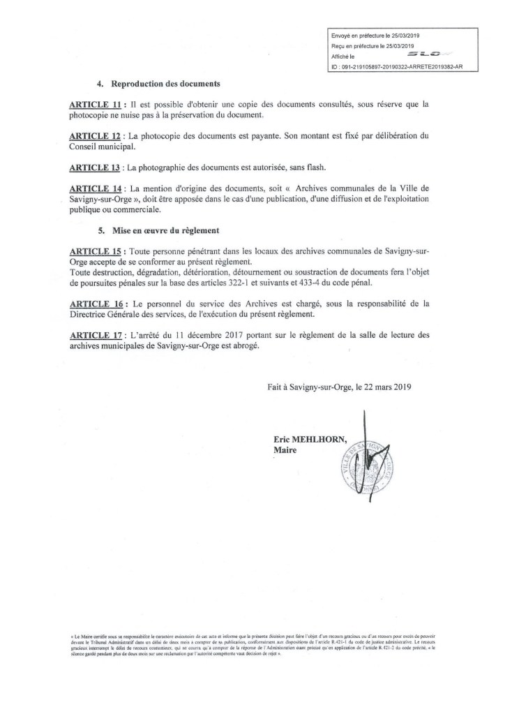 Je dispose encore d’un délai courant jusqu’à lundi (27 mai 2019) pour contester le nouveau règlement de la salle de lecture des archives et de la documentation de Savigny-sur-Orge. Et pourtant je ne le ferai probablement pas, alors que j’avais contesté le premier règlement qui entravait ma liberté d’accès aux actes administratifs de la Commune ; je m’en explique ici, essentiellement pour m’auto-justifier ce renoncement.