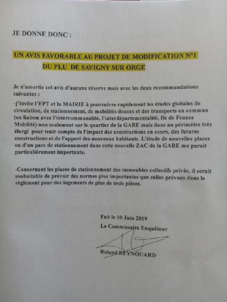 Dans l’attente d’accéder au rapport du commissaire enquêteur, je signale simplement que Roland RAYNOUARD a rendu un avis favorable au projet de modification n°1 du PLU de Savigny-sur-Orge ; malgré toutes les critiques que j’ai pu y apporter (encouragement du bétonnage, facilitation d’implantation de logement social au milieu des pavillons, création de la zone UEa pour bâtir 185 logements entre Corot et Monge).