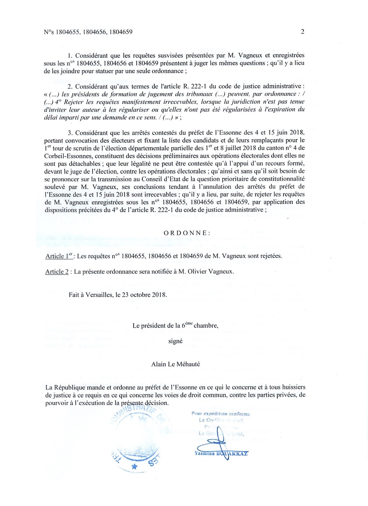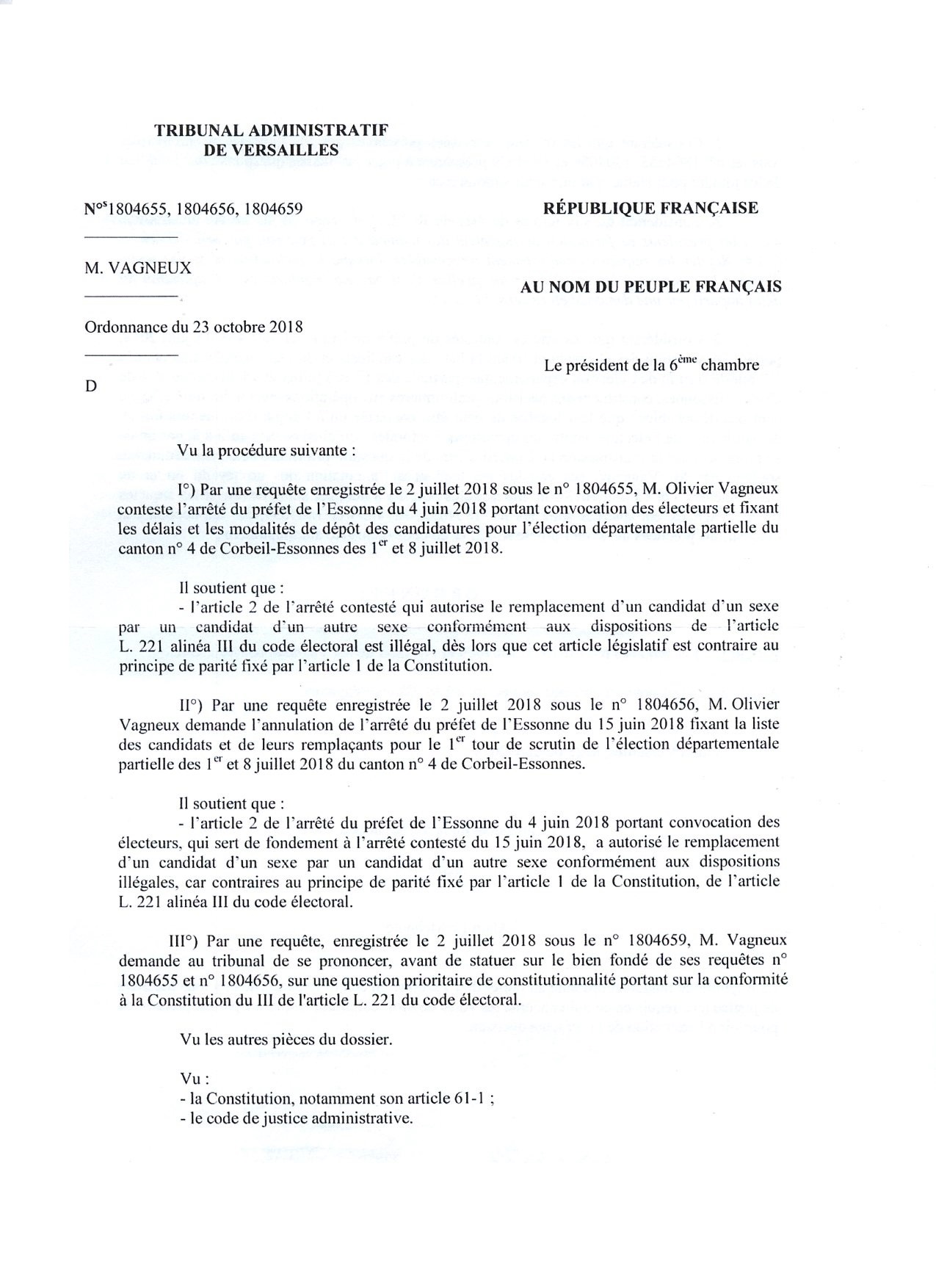 Il se trouve que l’affaire, déjà enregistrée par le greffe du Tribunal administratif de Versailles sous les références n°1804655, 1804656 et 1804659, a été examinée en première instance ; et qu’elle a fait l’objet d’une ordonnance de classement en date du 23 octobre 2018 (Pièce jointe).