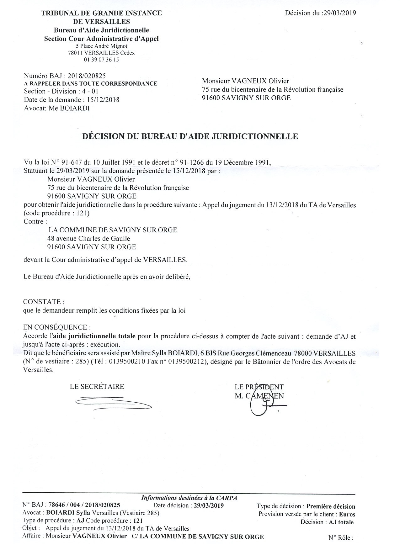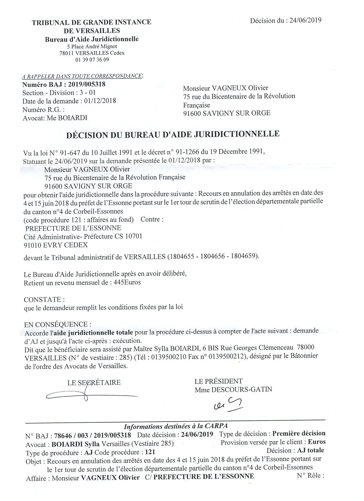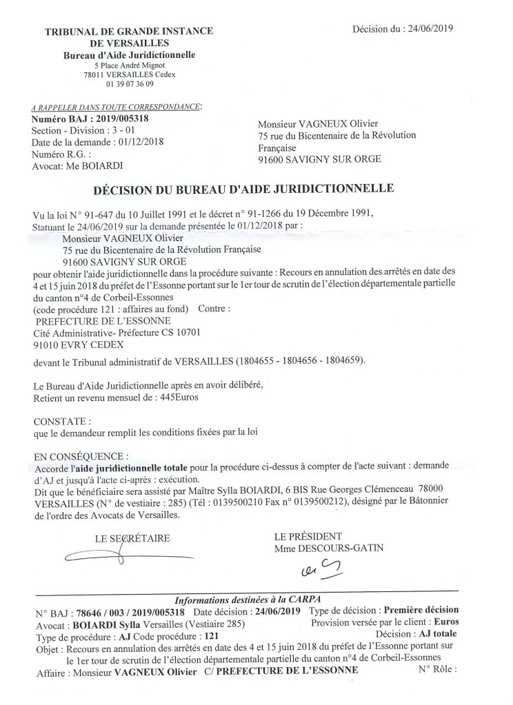 Je fais suite à la décision de votre bureau, en date du 24 juin 2019, qui m’accorde l’aide juridictionnelle totale pour la procédure suivante : « Recours en annulation des arrêtés en date des 4 et 15 juin 2018 du préfet de l’Essonne portant sur le 1er tour de scrutin de l’élection départementale partielle du canton n°4 de Corbeil-Essonnes ».