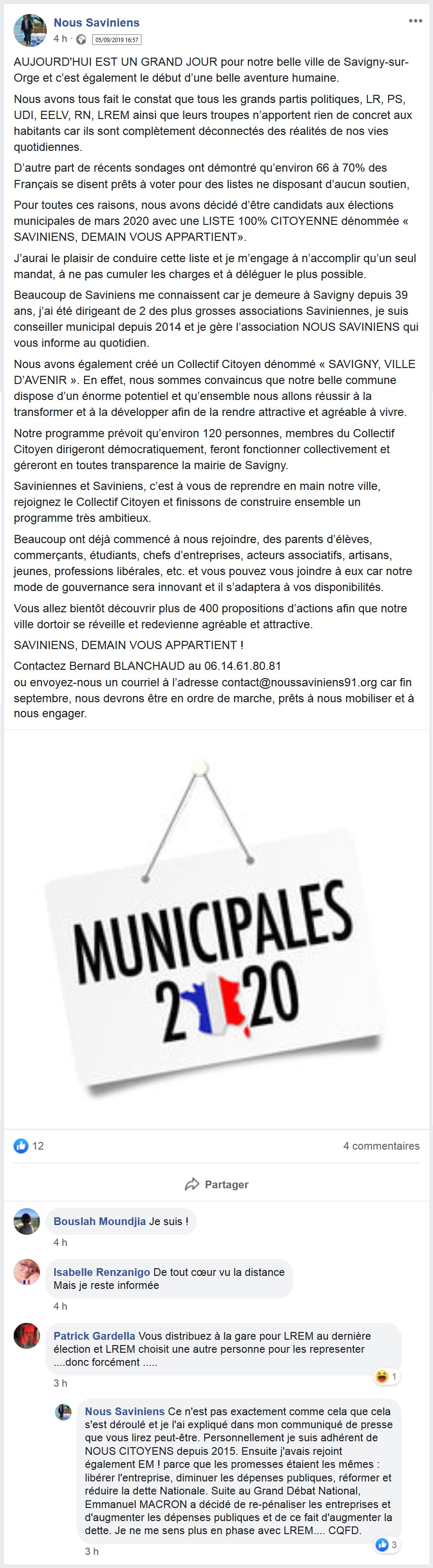 16 h 57 : Il annonce une liste citoyenne « Saviniens, demain vous appartient », et un collectif citoyen « Savigny, ville d’avenir ».