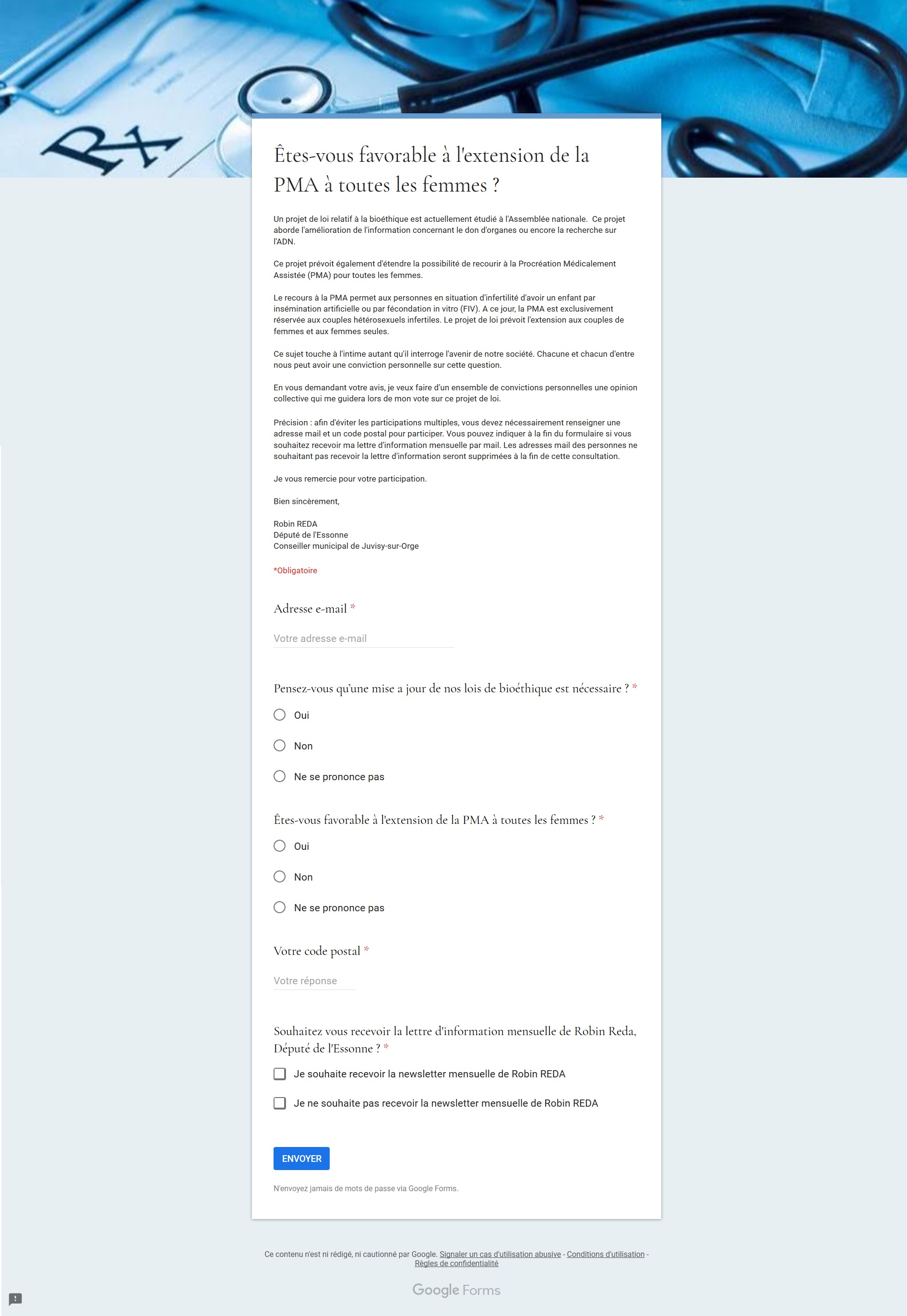 Et donc RÉDA, au moment de voter l’ensemble de la loi, demande l’avis de ses concitoyens sur ce seul sujet de la PMA, comme si c’était la seule évolution proposée par cette loi, qu’il présente en bon gauchiste comme un sujet intime (néanmoins remboursée par tous ces cons de Français).