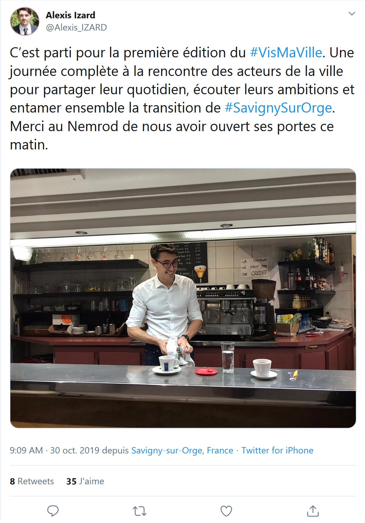 Alexis IZARD, candidat de La République en marche aux élections municipales 2020 à Savigny-sur-Orge joue au barman pendant six heures, et il croît connaître quelque chose de nos vies… Heureusement pour lui que ce n’était QUE la première édition de VisMaVille !