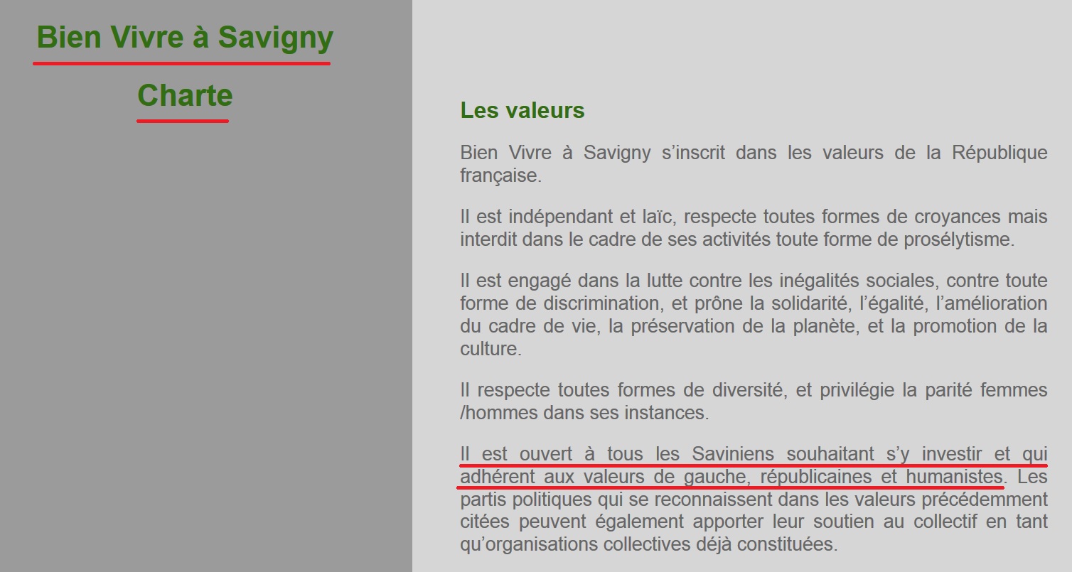 Je vais faire un tour sur leur site internet, et sur leur charte. [Bien Vivre à Savigny] est ouvert à tous les Saviniens souhaitant s’y investir et qui adhèrent aux valeurs de gauche, républicaines et humanistes. » Donc si tu es de droite, tu vas te faire voir…