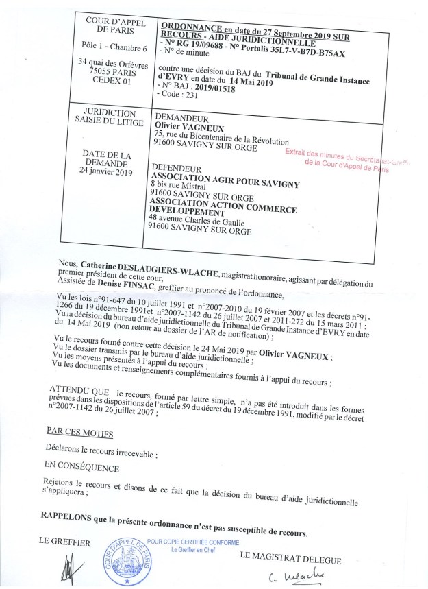 Toujours est-il que je n’aurais donc pas l’aide juridictionnelle pour obtenir la dissolution d’Agir pour Savigny (APS).