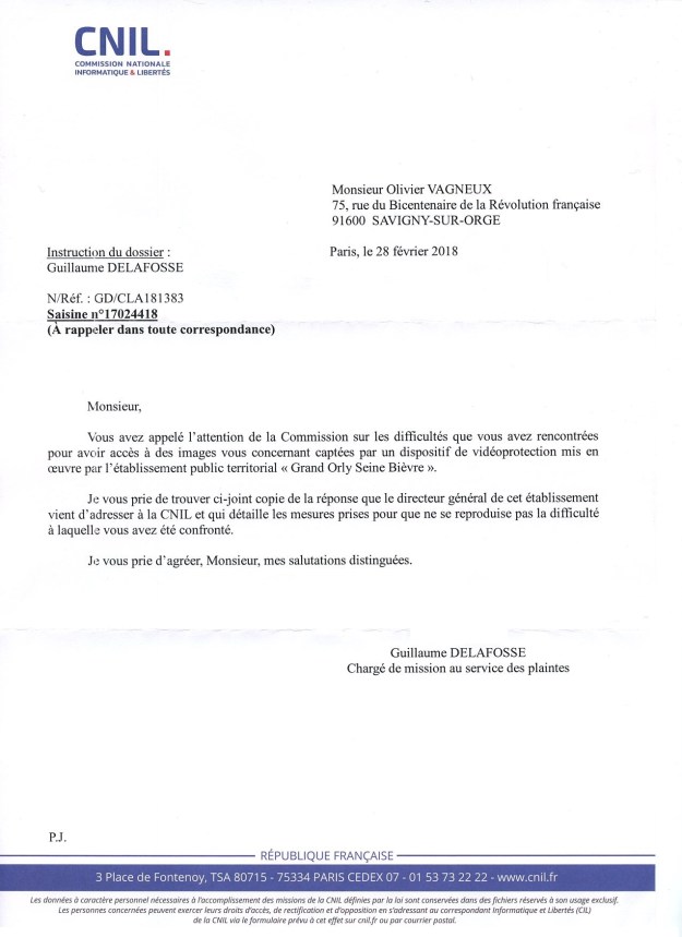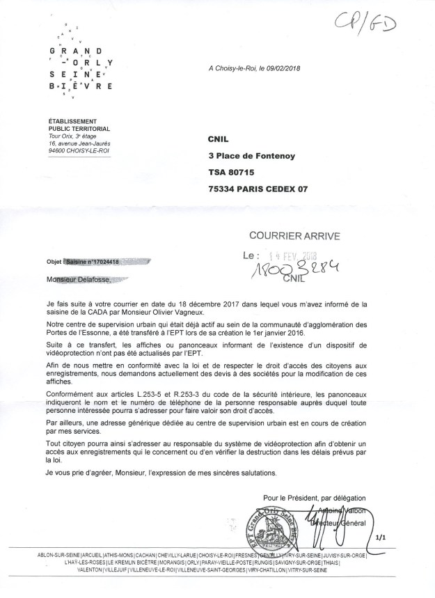 Et je voudrais simplement rappeler ici que c’est quand même grâce à ma plainte auprès de la CNIL en 2017, que l’EPT GOSB a été contraint de mettre à jour les panneaux d’informations de la vidéoprotection pratiquée à Savigny. Et j’en veux pour preuve les courriers qui suivent.