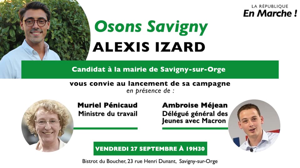 En septembre 2019, le logo de La République en marche est plutôt bien visible, par exemple sur cette invitation à une réunion en présence de la ministre du Travail qui n’est pas venue, et s’est contentée d’une interchangeable vidéo de soutien.