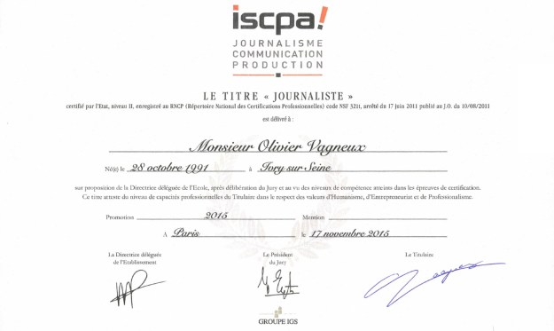 Eh bien, chers confrères du Parisien, apprenez donc que je dispose d’un diplôme ou d’un titre niveau II, appelez-le comme vous voulez, certifié par l’État, obtenu à l’Institut supérieur des médias de Paris.