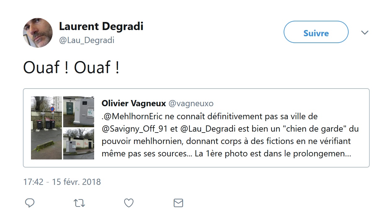 On dirait que Laurent DEGRADI n’a toujours pas digéré que je puisse mettre en doute son objectivité journalistique… Quand bien même, la recopie de quelques communiqués de presse du maire, auxquels on ajoute quelques erreurs d’orthographe et l’interview d’un opposant pour faire « travaillé », ne permettront pas la réélection de MEHLHORN, parce que l’opinion publique n’a plus besoin du « quatrième pouvoir » pour savoir quoi penser.