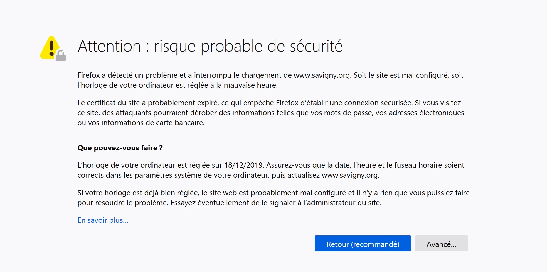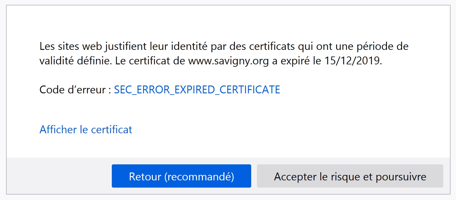 C’est bien la peine qu’on paye 2160 euros s’ils ne sont pas capables de renouveler les certificats de sécurité dans les temps… Il est surtout temps qu’on se dote d’un site internet enfin ergonomique et fonctionnel, ce qui commence par une simple réorganisation des onglets. Viendra ensuite qu’on changera certains logiciels de réservation qui nous imposent unilatéralement des conditions d’utilisation abusives et intrusives.