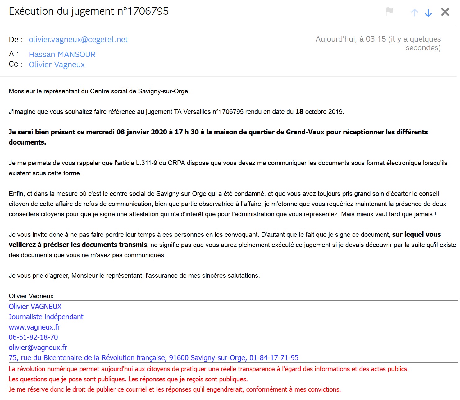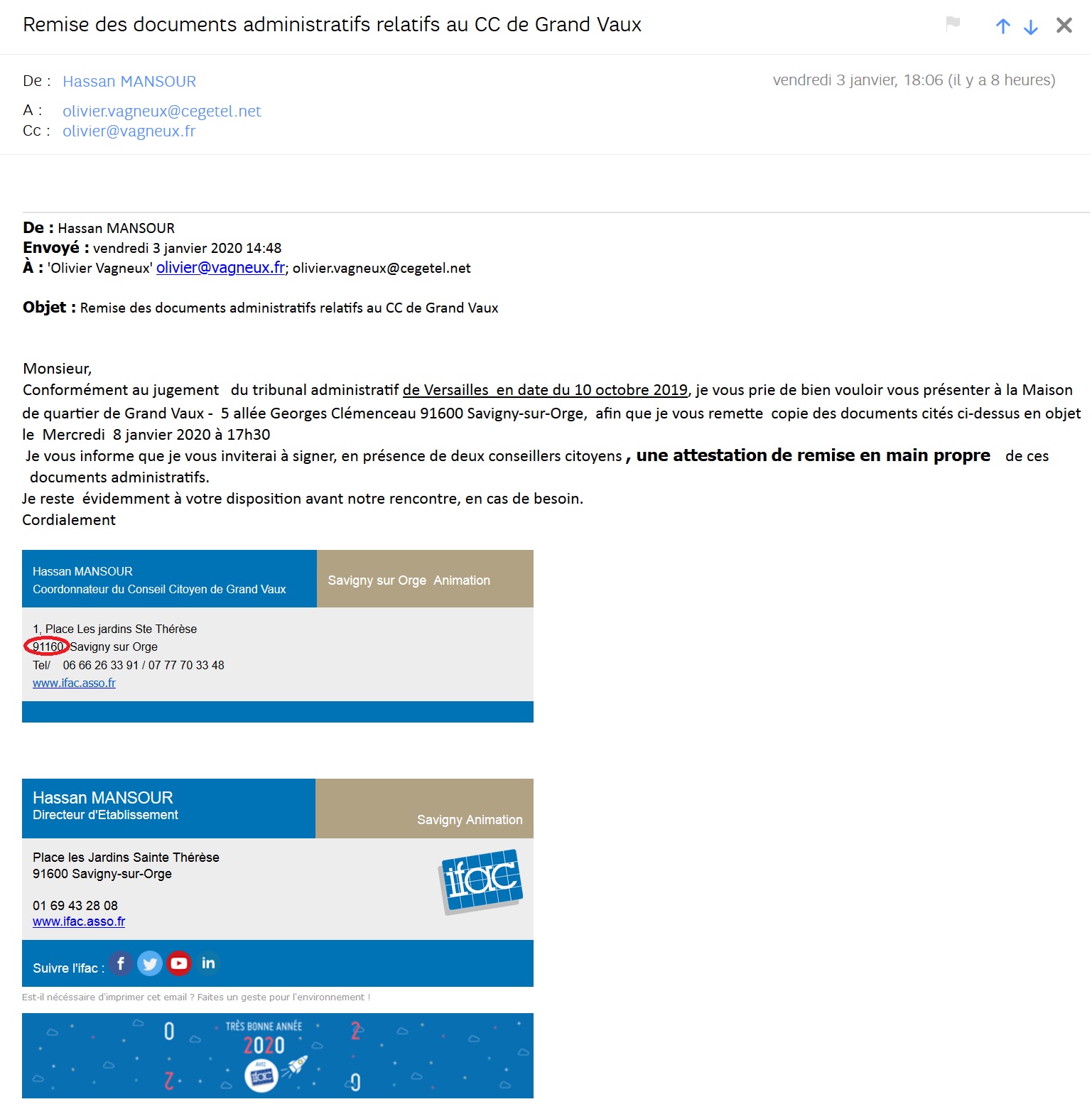 Conformément au jugement du tribunal administratif de Versailles en date du 10 octobre 2019, je vous prie de bien vouloir vous présenter à la Maison de quartier de Grand Vaux – 5 allée Georges Clémenceau 91600 Savigny-sur-Orge, afin que je vous remette copie des documents cités ci-dessus en objet le Mercredi 8 janvier 2020 à 17h30