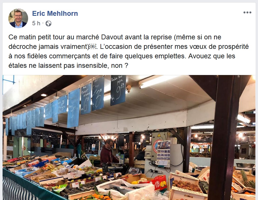 Enfin bon, c’est toujours moins pire que Éric MEHLHORN, qui nous révèle sur Facebook qu’il n’était en fait pas parti en vacances puisqu’il ne « décroche jamais vraiment », et qui s’étale, ou plutôt qui étale sa méconnaissance du mot « étal », au pluriel « étals » parce qu’à trois mois des élections, il se met à aimer les commerçants et à faire leurs courses chez eux…
