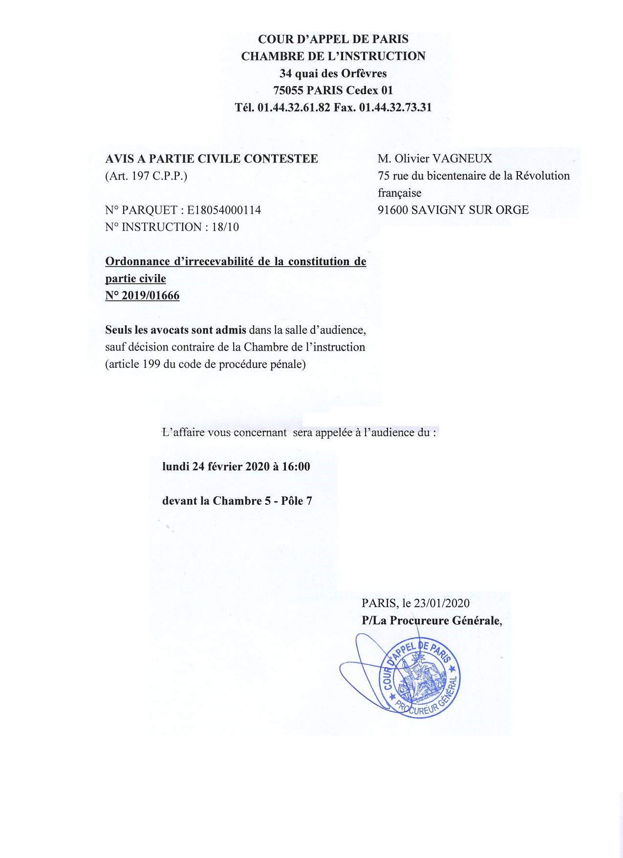 La procureure générale près la Cour d’appel de Paris nous communique l’avis d’audience de notre affaire de contestation de l’ordonnance d’irrecevabilité de notre constitution de partie civile contre la prise illégale d’intérêts d’Éric MEHLHORN lorsqu’il s’était voté la protection fonctionnelle pour me faire condamner en diffamation.