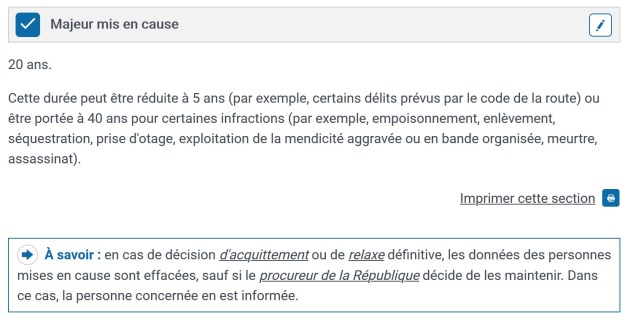 C’est donc que non seulement je n’y figure plus, mais encore que la procureure a appliqué une procédure d’exception en ordonnant l’effacement des mentions me concernant, puisqu’en application de l’article 230-8 du code de procédure pénale : « Les décisions de non-lieu et de classement sans suite font l’objet d’une mention, sauf si le procureur de la République ordonne l’effacement des données personnelles. »