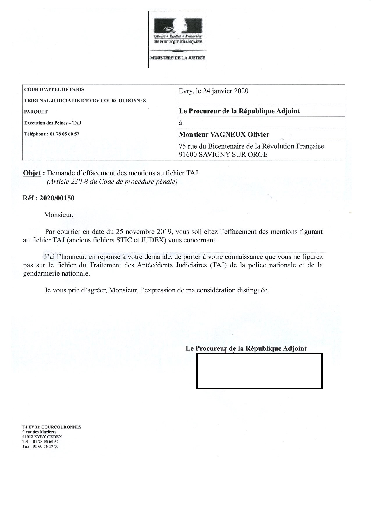 « Vous ne figurez pas sur le fichier du Traitement des antécédents judiciaires (TAJ) de la police nationale et de la gendarmerie nationale. »