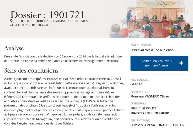 Pour mémoire, le dossier TA Paris n°1901223 concerne le refus d’accès qui m’a été opposé par le préfet de Police à ma demande de communication des éléments contenues sur moi dans les fichiers du renseignement territorial. Tandis que le dossier TA Paris n°1901721 concerne le même refus opposé cette fois par le ministre de l’Intérieur.