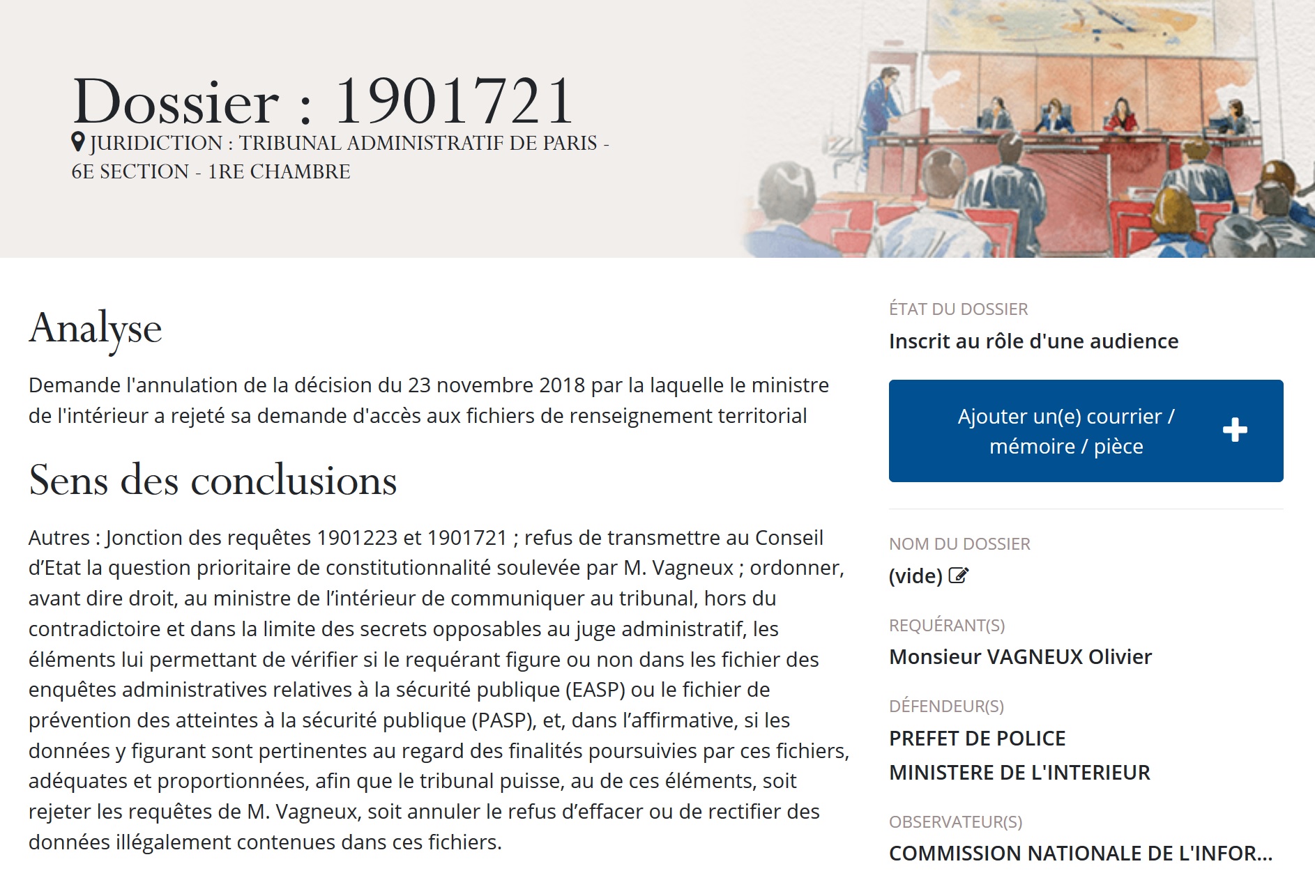 Pour mémoire, le dossier TA Paris n°1901223 concerne le refus d’accès qui m’a été opposé par le préfet de Police à ma demande de communication des éléments contenues sur moi dans les fichiers du renseignement territorial. Tandis que le dossier TA Paris n°1901721 concerne le même refus opposé cette fois par le ministre de l’Intérieur.